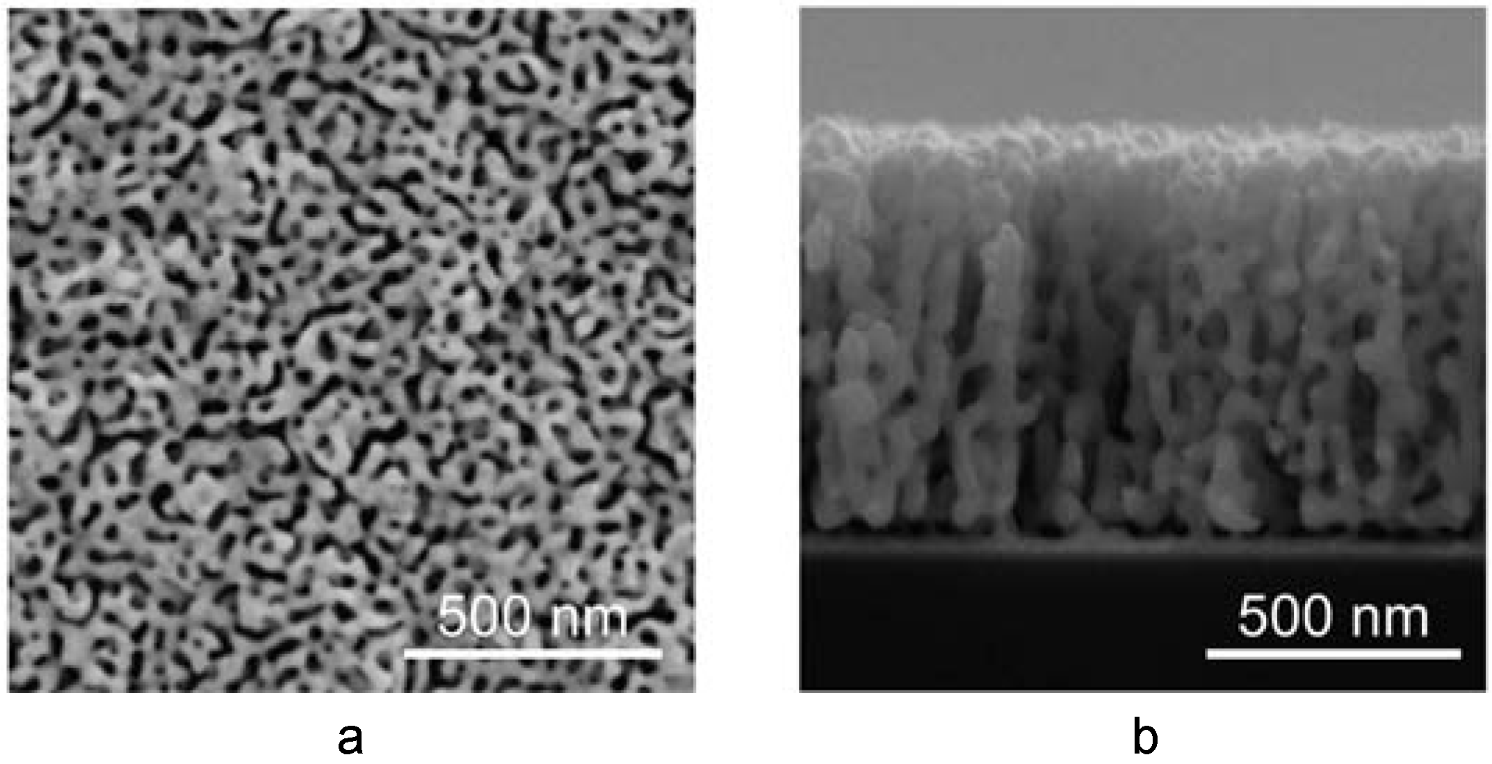 Scanning electron micrographs of typical np-Au morphology: (a) top view, and (b) cross-sectional view.