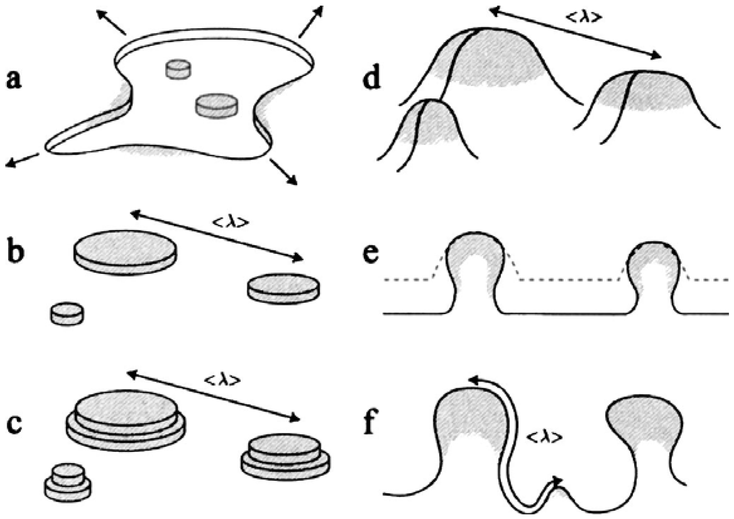 Illustration of porosity formation during dealloying: (a) lateral removal of less noble atoms (uncolored) leading to clustering of noble atoms (shaded) on surface; (b) supplied with remaining noble atoms from dissolution, clusters coarsen until the next alloy layer is attacked, as the characteristic length <λ> appears; (c) noble atom-capped hills form as the second layer of alloy dissolves, while the characteristic length between hills remains the same; (d) less noble atoms can accumulate at the bases of hills, since their perimeters are widening, without changing the characteristic length; (e) undercutting of hills (compared the original morphology denoted with a dashed line) and increase in average distance between hills measured along the alloy-electrolyte interface; (f) new noble atom hills nucleate as the hill-hill distance along the alloy-electrolyte distance is approximately twice the characteristic length. [Reproduced with permission from J. Electrochem. Soc. 2004, 151, C614–C626. © 2004, The Electrochemical Society].
