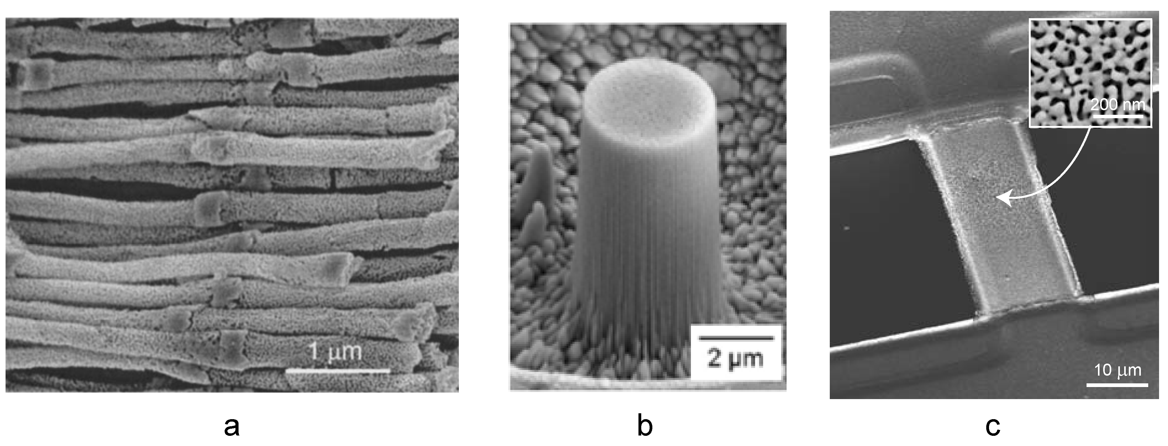 Examples of microfabricated np-Au structures: (a) nanowires produced by electroplating on a porous alumina template [Reproduced with permission from Appl. Phys. Lett. 2002, 81, 4437–4439. © 2002, American Institute of Physics]; (b) nano-pillar fabricated by focused ion beam [Reproduced with permission from Appl. Phys. Lett. 2006, 89, 061920. © 2006, American Institute of Physics]; and (c) freestanding beam fabricated by photolithography. [Reproduced with permission from Acta Mater. 2007, 55, 4593–4602. © 2007, Elsevier].