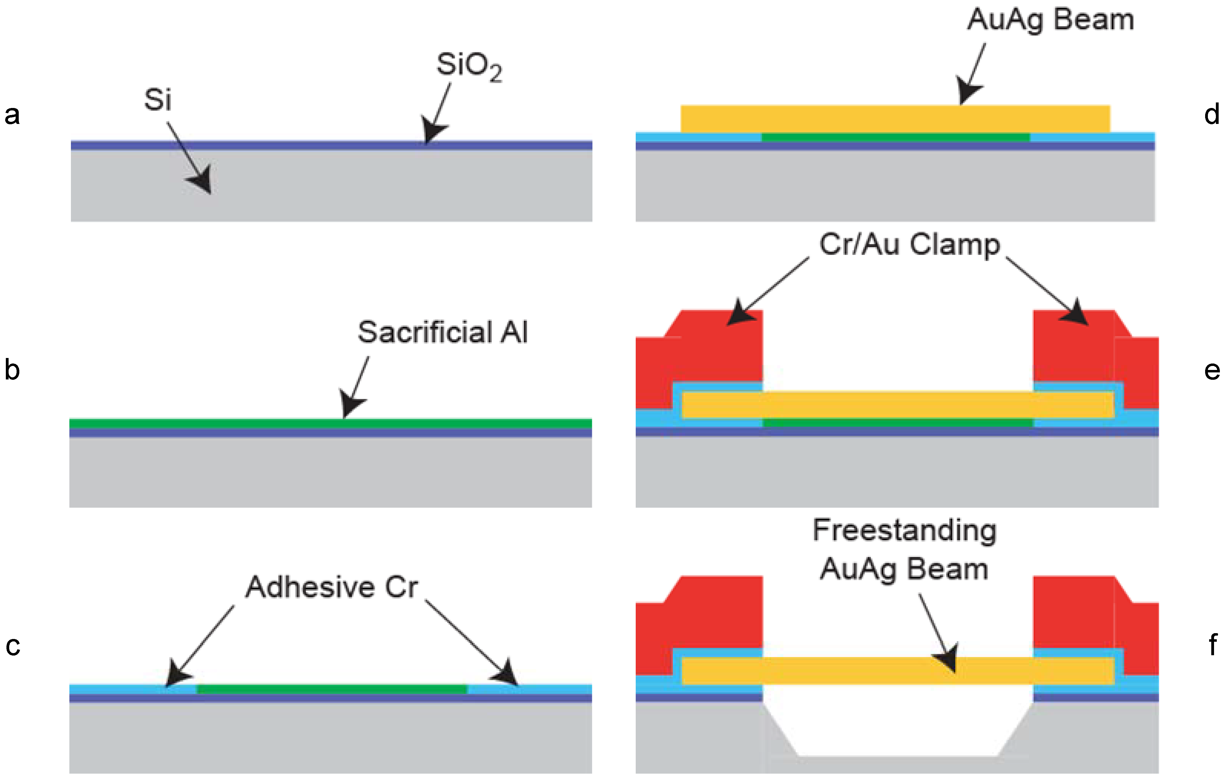 Schematic of freestanding Au-Ag beam fabrication: (a) ~80 nm-thick thermal SiO2 is deposited onto a p-type 50 mm Si (100) wafer; (b) ~60 nm-thick Al is sputter-deposited to serve as a sacrificial layer; (c) planar foundation layer is produced by etching and photolithographic-patterning Cr pedestals for adhesion; (d) ~800 nm-thick Au0.3Ag0.7 (atomic fraction) beam is sputtered-deposited through a photoresist micro-stencil layer; (e) beam is clamped onto the substrate by sputter-depositing Cr (~50 nm-thick) and Au (~500 nm-thick), and subsequent electroplating of ~3 µm-thick Au; and (f) beam is released by consecutively etching Al, SiO2, and Si, and critical-point drying.