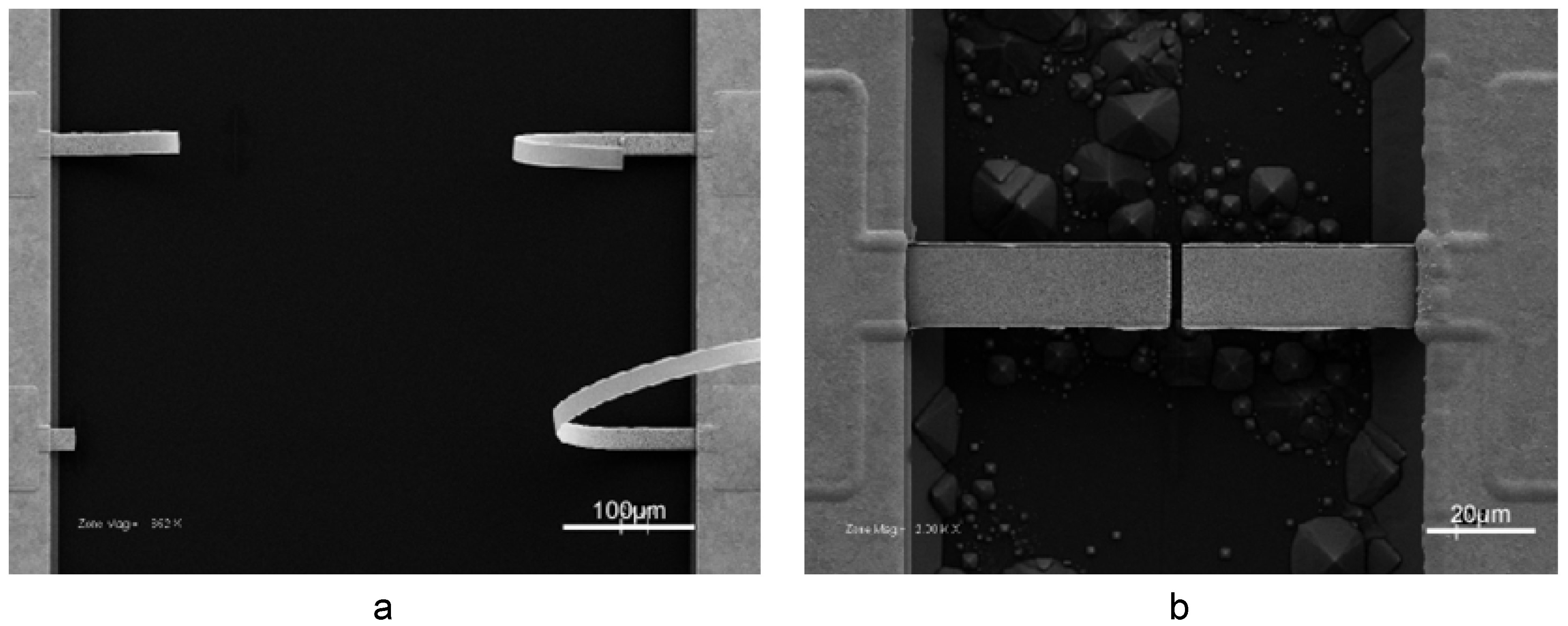 While it is possible to fabricate np-Au beams from micro-patterned Au-Ag beams (with the method to be described in Section 3.6), micro-patterned Au-Ag cantilevers warp catastrophically during dealloying, probably due to asymmetric dissolution rates, and hence stress generation, on opposite surfaces of the beams (Figure 5a). However, it is possible to produce np-Au cantilevers by cutting np-Au beams with FIB (Figure 5b) [42].