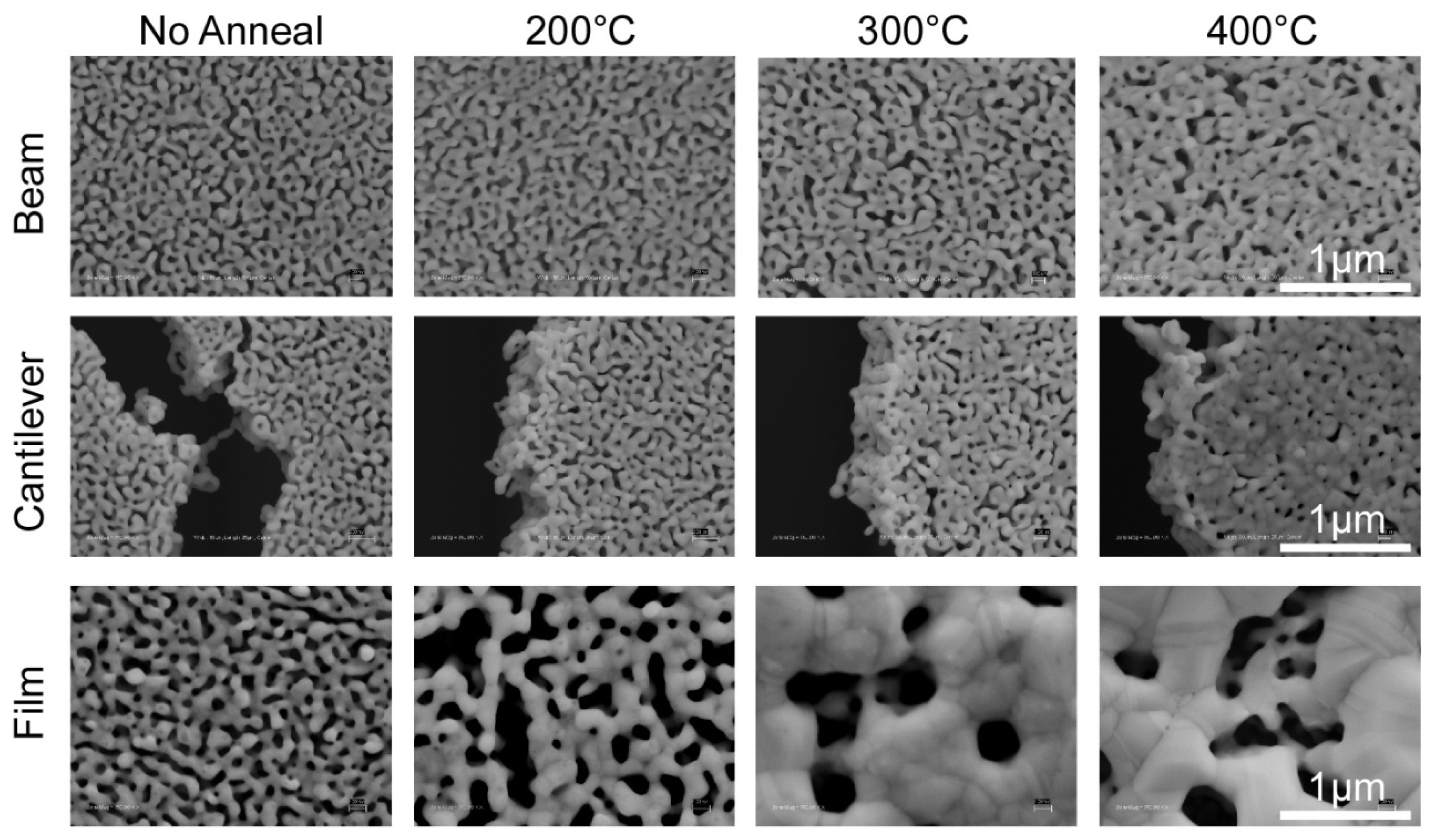 The mechanical constraints, and hence stress evolution in np-Au structures exposed to thermal treatment, result in profound differences in porosity evolution [42], as shown in Figure 6. The porosity of all three structures decreased (from ~30% to ~15%) as the thermal treatment temperature increased. Conversely, average pore size decreases insignificantly for beams and cantilevers, while the blanket films exhibited non-monotonic increases with increasing temperature. Beams developed micro-cracks in response to accumulation of tensile stress, while cantilevers contracted as their pores vanished. Films displayed the evolution of large clusters of gold and significant pore coalescence (accompanied by reduction in film thickness) with increasing temperature. Differences in morphology are also evident between beams, cantilever, and blanket films that were not exposed to thermal treatment, suggesting that it is probable that mechanical constraints (and resultant stress states) lead to morphological changes in porosity evolution during dealloying. The effect of mechanical constraints in morphology evolution requires further research, and can benefit greatly from molecular simulations. An interesting experiment may involve real-time observation of porosity evolution under thermo-mechanical stress using a scanning electron microscope with a heated stage to probe routes of coarsening.