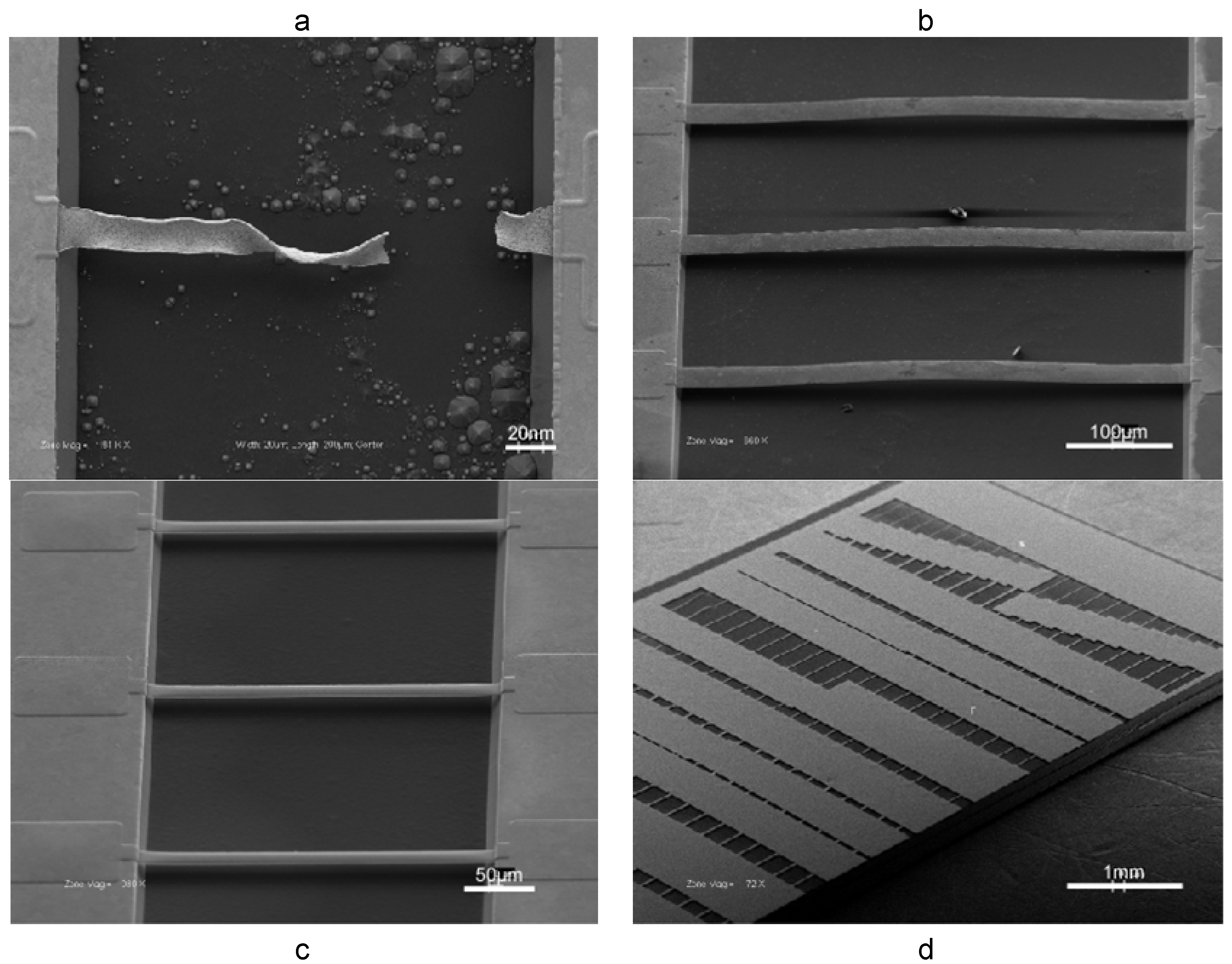 Shrinkage during dealloying becomes especially problematic in fabrication of constrained microstructures, such as doubly-clamped beams [42]. Figure 7a is an SEM micrograph illustrating catastrophic failure of a microbeam during dealloying. A novel solution to this problem is the rapid thermal treatment of solid Au-Ag alloy microbeams, resulting in their permanent buckling [43], as shown in Figure 7b. The underlying mechanisms of how rapid thermal treatment leads to a permanently buckled beam shape are multifaceted. A complex interplay of work hardening, thermal expansion, and changes in alloy microstructure due to thermo-mechanical stress likely result in permanent beam buckling. Regardless, the buckled shape produces a positive strain to offset shrinkage during dealloying, thereby mitigating tensile stress accumulation during dealloying and producing intact np-Au beams (Figure 7c). The outlined process enabled the fabrication of hundreds of intact np-Au beams (~3600 beams per 50 mm wafer) with close to 100% fabrication yield (Figure 7d). The beam dimensions ranged between 5 to 50 μm in width and 10 to 500 μm in length. Systematic variation of the thermal treatment temperature of the alloy exposed a correlation between the maximum amplitude of permanent beam buckling (buckling amplitude increases monotonically with temperature up to 350 ºC) and percentage of microbeams that survived dealloying without fracture.