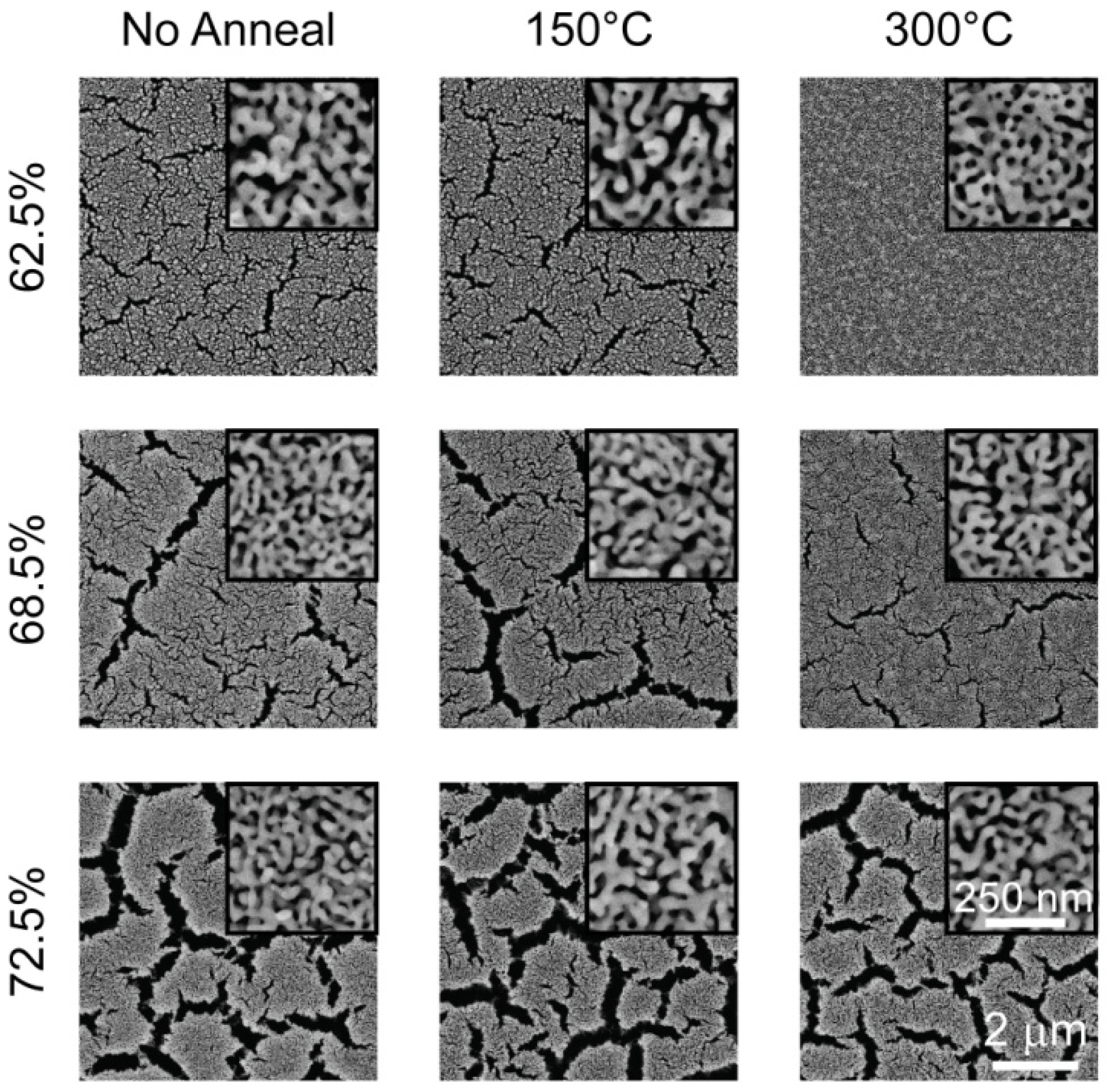 Similar crack/void formations are evident in blanket np-Au films on rigid substrates [19,44], as well as micropillars [35]. Methods to alleviate these formations include low-temperature dealloying [63] and multi-step dealloying techniques [64]. Thermal treatment of the blanket alloy film non-monotonically reduced void formation [44]. Figure 8 illustrates the effect of thermally treating a Au-Ag blanket film prior to dealloying. While there were not significant changes in nanopororous structure, thermal treatment generally reduced cracks. It is plausible that thermal treatment leads to work hardening of the alloy and increases the ultimate strength of ligaments; that is, if the failure of a critical number of ligaments leads to crack/void formation, stronger ligaments will in turn reduce crack formation in blanket films.