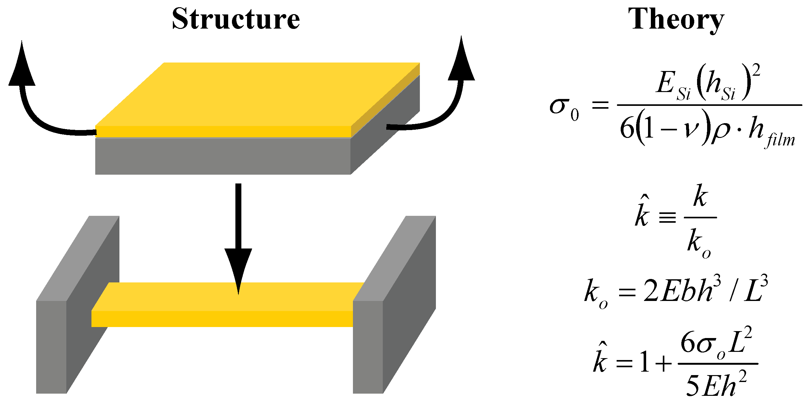 Illustration of common mechanical characterization methods to measure residual stress. In the beam residual stress calculation, is the ratio of measured beam stiffness k to theoretical beam stiffness k0, E is beam elastic modulus, b is beam width, h is beam thickness, L is beam length, and σ0 is the beam residual stress. For blanket film residual stress calculation, ESi is elastic modulus of silicon wafer, hSi is silicon wafer thickness, υ is Poisson’s ratio of silicon wafer, ρ is measured radius of curvature of silicon wafer, and hfilm is the film thickness.