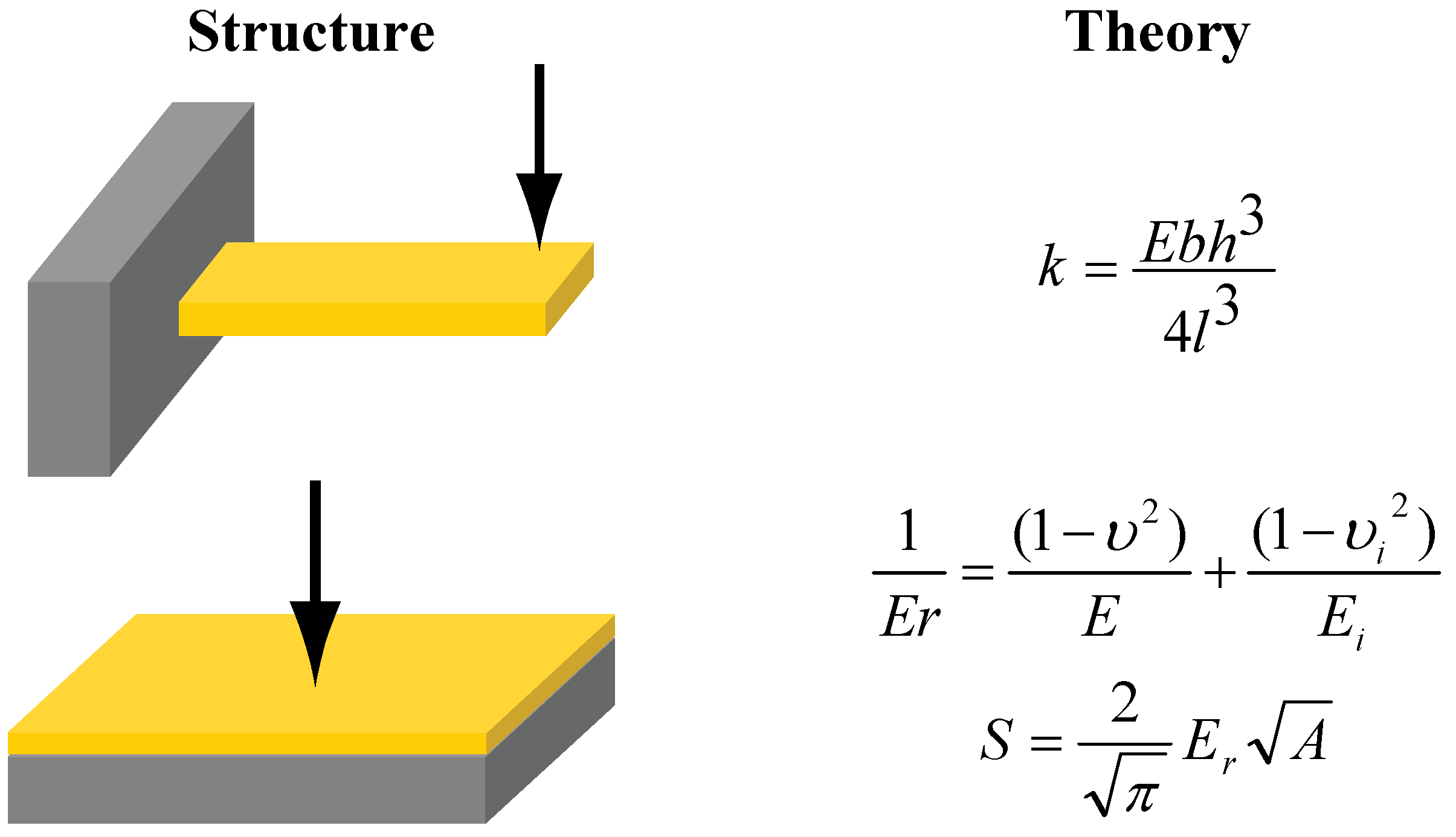 Illustration of various mechanical characterization methods and structure employed. In the cantilever elastic modulus calculation, E is elastic modulus, b is beam width, h is film thickness, l is distance between point of measurement and beam pivot point, and k is measured beam stiffness. In the blanket film elastic modulus calculation, υ and υi are Poisson’s ratios of film and indenter tip respectively, and E and Ei are elastic moduli of film and indenter tip respectively. In the calibration equation, S is measured stiffness, A is tip contact area, and Er is reduced elastic modulus. Calibrations are usually done on silica standards.
