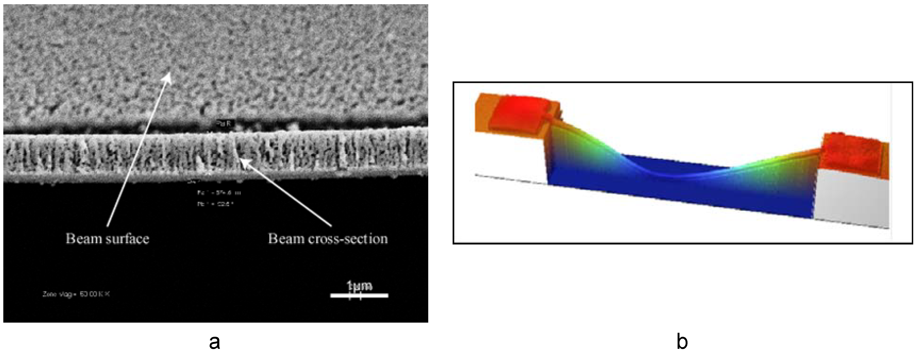 (a) FIB-prepared beam cross-section for thickness measurement. (b) A typical interferometric image of the buckled beam shape following rapid thermal treatment of freestanding Au-Ag beam.