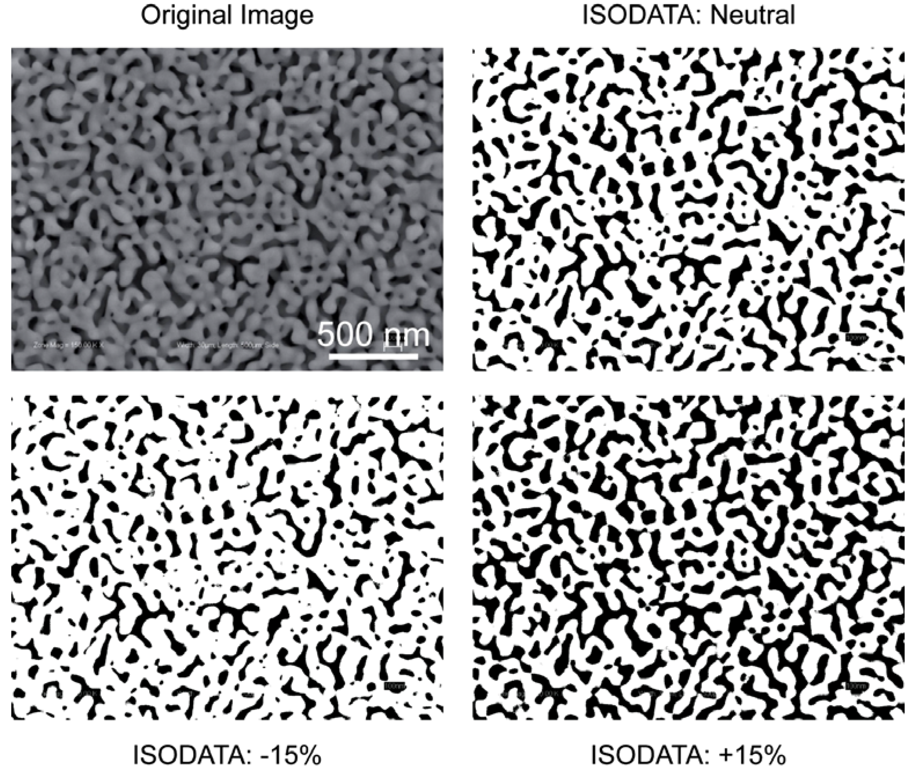The percent coverage of pores (dark regions), as well as calculated values, depend on the thresholding level selected. For the example image above, the calculated percent porosity and average pore size values were 30% and 80 nm for the “neutral” case; 23% and 65 nm for the “−15%” case; and 39% and 110 nm for the “+15%” case.