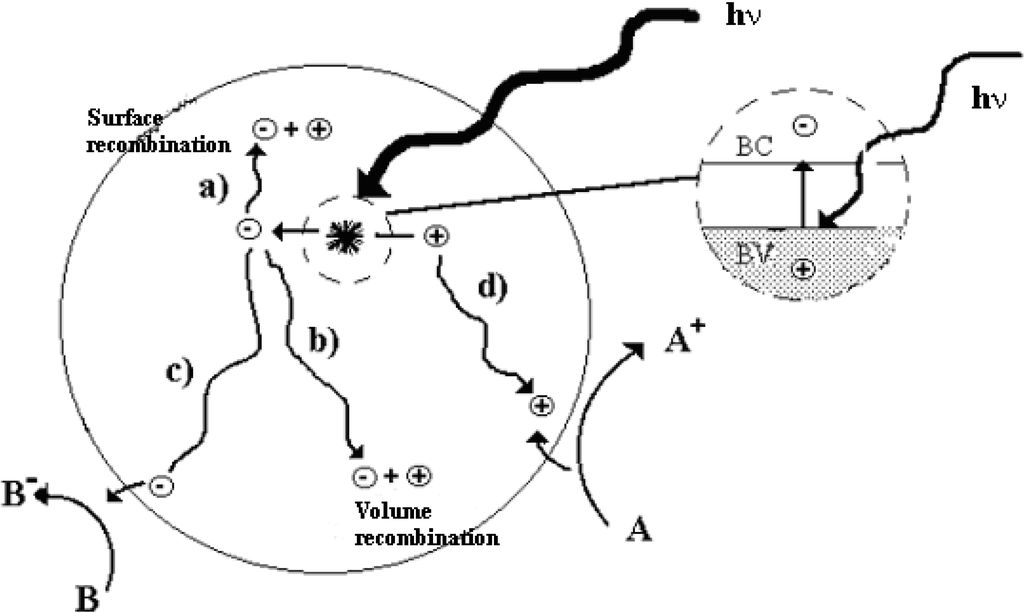 A photocatalytic reaction is initiated when a photoexcited electron is promoted from the filled valence band of a semiconductor photocatalyst (SC) to the empty conduction band as the absorbed photon energy, hυ, equals or exceeds the band gap of the semiconductor photocatalyst, leaving behind a hole in the valence band. In concert, electron and hole pair (e–h+) is generated. The following chain reactions have been widely accepted: