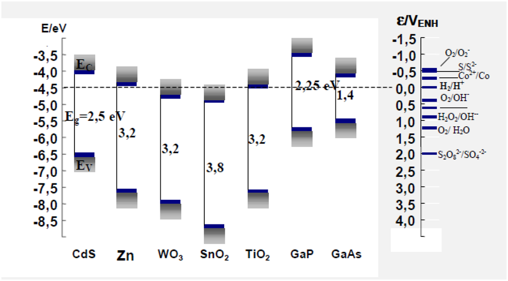 Nanometric size titania is by far the most widely employed system in photocatalysis due to its comparatively higher photocatalytic activity, low toxicity, chemical stability and very low cost. The anatase form of titania is reported to give the best combination of photoactivity and photostability [7]. Nearly all studies have focused on the crystalline forms of titania, namely anatase and rutile. The minimum band gap energy required for photon to cause photogeneration of charge carriers over TiO2 semiconductor (anatase form) is 3.2 eV corresponding to a wavelength of 388 nm [67]. Practically, TiO2 photoactivation takes place in the range of 300–388 nm. The photoinduced transfer of electrons ocurring with adsorbed species on semiconductor photocatalysts depends on the band-edge position of the semiconductor and the redox potentials of the adsorbates [20]. The schematic diagram of band positions for various semiconductors is shown in Figure 2.