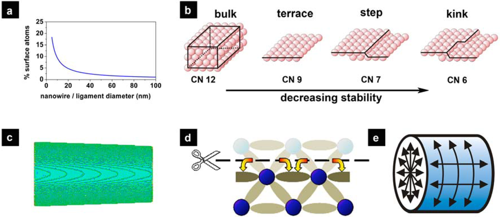 Enrico Fermi reputedly said “God made the solid state. He left the surface to the devil” to describe the fact that surfaces and interfaces are difficult to treat theoretically due to their complex nature. On the other hand, one can exploit this complexity to design tunable interface controlled materials with high surface area such as nanoparticles, nanowires and low-density nanoporous materials. Their surface-to-volume ratio increases with deceasing feature size (Figure 1a), and for small enough feature sizes, their properties are no longer dominated by the bulk of the material but by surface atoms. Based on coordination, one can differentiate between three types of surface atoms which, in the order of decreasing coordination, are terrace atoms, step edge atoms, and kink sites (Figure 1b). Simple geometrical considerations reveal that the curved surfaces, which are typical for most high surface area materials (Figure 1c), are dominated by the more undercoordinated step edge and kink site surface atoms. It is indeed the undercoordination which gives rise to new properties. For example, surface stress is the consequence of an electronic relaxation (Figure 1d) by transferring electronic charge into in-plane bonds []. This surface stress induces a pressure in the bulk (Figure 1e) that then further affects the chemical, physical and mechanical properties of the material. For example, theoretical studies have shown that tensile strain can make gold less noble by increasing the ability of gold to bond simple adsorbates more strongly [,]. Thus high surface area materials open a new dimension in material design for a multitude of technological important areas, including energy storage and conversion, sensing and catalysis. Beyond morphology, the properties of high surface area materials can be further tuned by surface engineering.
