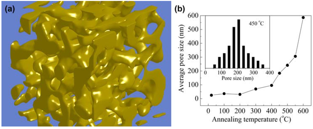 (a) Focused ion beam nanotomography image showing the 3D-structure of bulk nanoporous Au (in collaboration with L. Holzer, Ph. Gasser and B. Münch from EMPA, Switzerland). The ligament size is ~30 nm. (b) Dependence of the average pore width on annealing temperature (Argon atmosphere, 2h). The inset shows the distribution of pore widths after annealing at 450 °C.