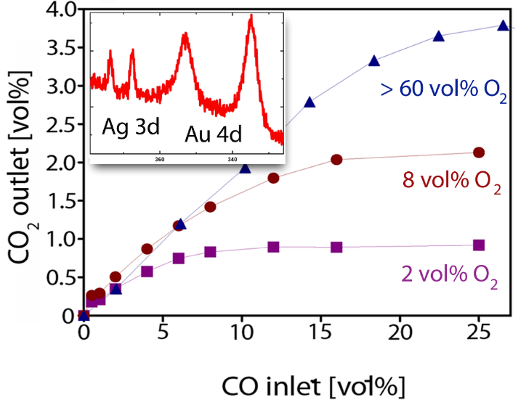 An example demonstrating the high catalytic activity of np-Au for CO oxidation at 20 °C. Shown is the dependence of the CO2 concentration produced on the CO concentration supplied for different oxygen partial pressures. Total conversion is observed up to 2 vol % CO, at higher CO concentrations in the feed the conversion becomes limited by mass transport. The measurements were performed in a continuous flow reactor described in detail in ref. []. Inset: The amount of Ag present on the ligament surface of np-Au can be quantified by x-ray photoemission spectroscopy (shown are the Ag 3d and Au 4d regions).