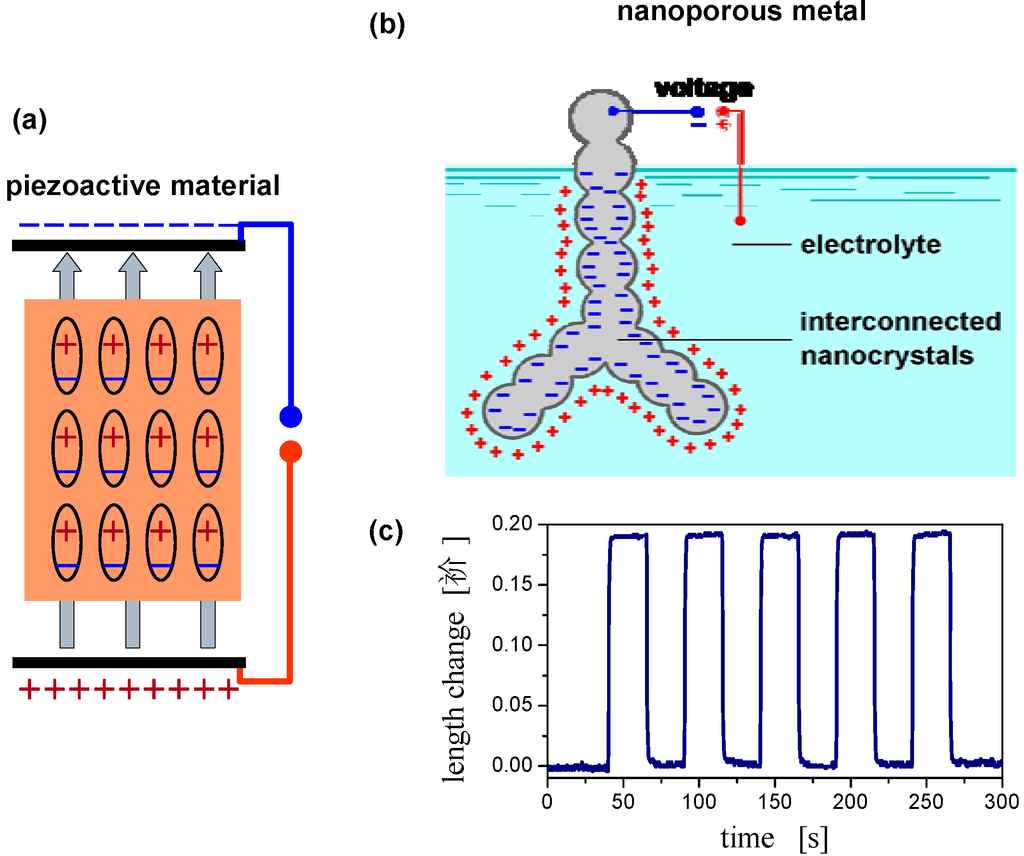 Schematic representation of actuation mechanisms in a conventional piezoceramic (a) and in a nanoporous metal (b). Response of the macroscopic length change to cyclic potential jumps is illustrated by the experimental data in (c). Parts (b) and (c) are reproduced from Refs. [] and [], respectively.