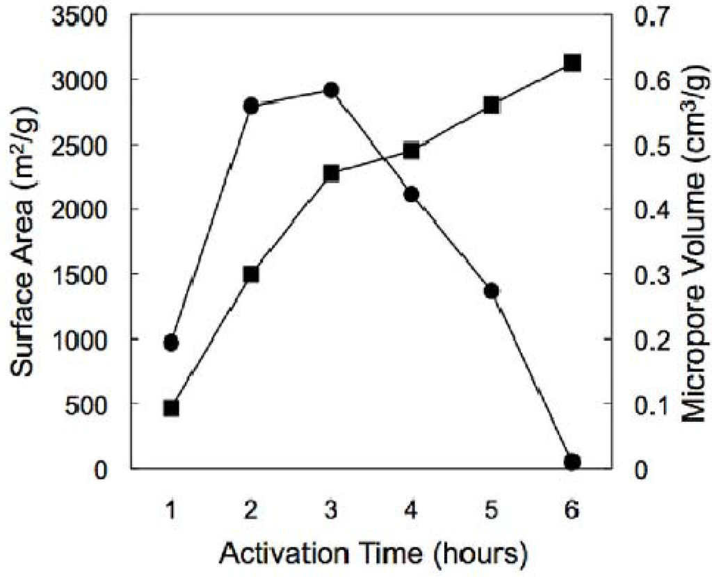 BET surface area (■) and micropore volume (●) for the activated CAs as a function of activation time.