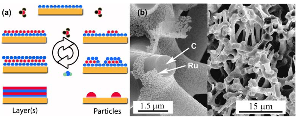 (a) ALD employs sequential, self-limiting surface reactions to overcome diffusion limitations. Both conformal films (left) and individual nanoparticles (right) can be grown, depending on the surface chemistry. (b) SEM micrographs of the fracture surface of a Ru-coated CA at different magnification levels. Carbon ligaments and the Ru nanoparticle film are indicated the arrows labeled “C” and “Ru”, respectively. Part (b) is reproduced from Ref. [].