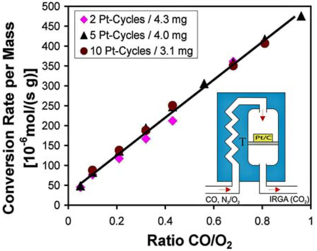 The measurements were carried out using a continuous flow reactor (for a more detailed description see also []). Catalytic activity was observed at temperatures of 180 °C and above. At lower temperatures, the Pt catalyst surface is poisoned by CO []. The CO conversion rate increases linearly with the CO content in the feed (see Figure 13) thus suggesting that the conversion of CO is close to 100%. Most importantly, it was found that the measured conversion rates were independent of the actual Pt loading, and that the maximum catalytic activity was reached at only two cycles of ALD.