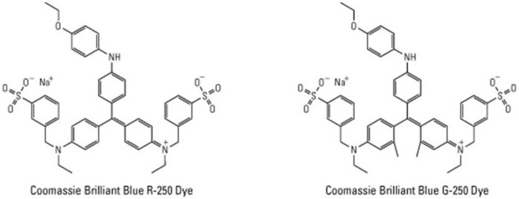 Chemical structures of Coomassie brilliant blue R-250 (left) and G-250 (right).