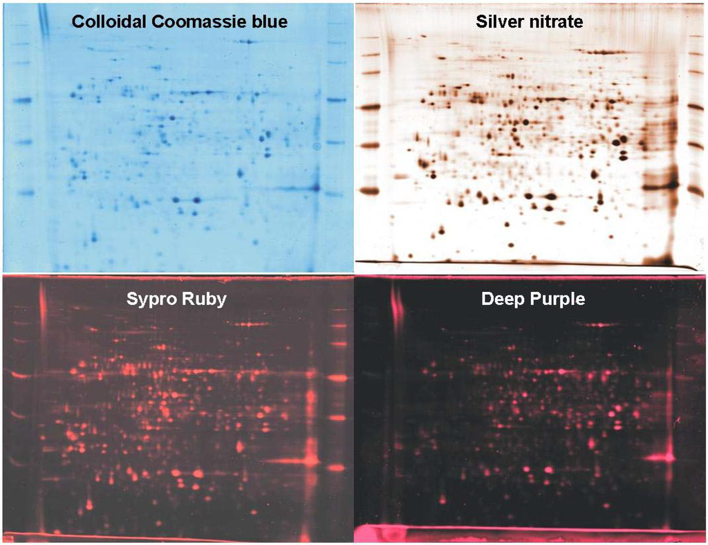| Colloidal Coomassie blue | Silver nitrate | Sypro Ruby | Deep Purple | DIGE | |