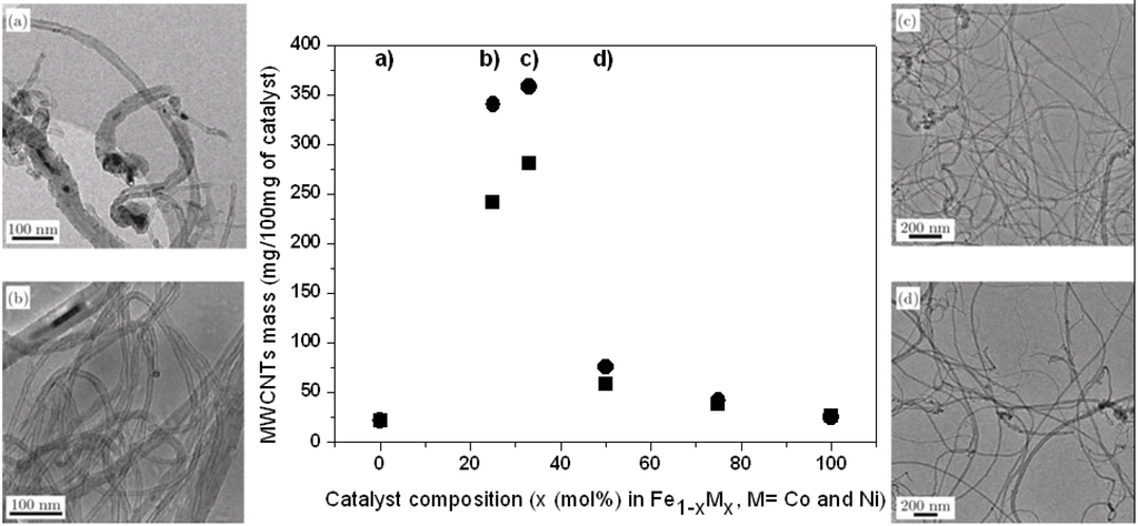 - Flahaut, E.; Govindaraj, A.; Peigney, A.; Laurent, Ch.; Rousset, A.; Rao, C.N.R. Synthesis of single-walled carbon nanotubes using binary (Fe, Co, Ni) alloy nanoparticles prepared in situ by the reduction of oxide solid solutions. Chem. Phys. Lett. 1999, 300, 236–242. [Google Scholar] [CrossRef]