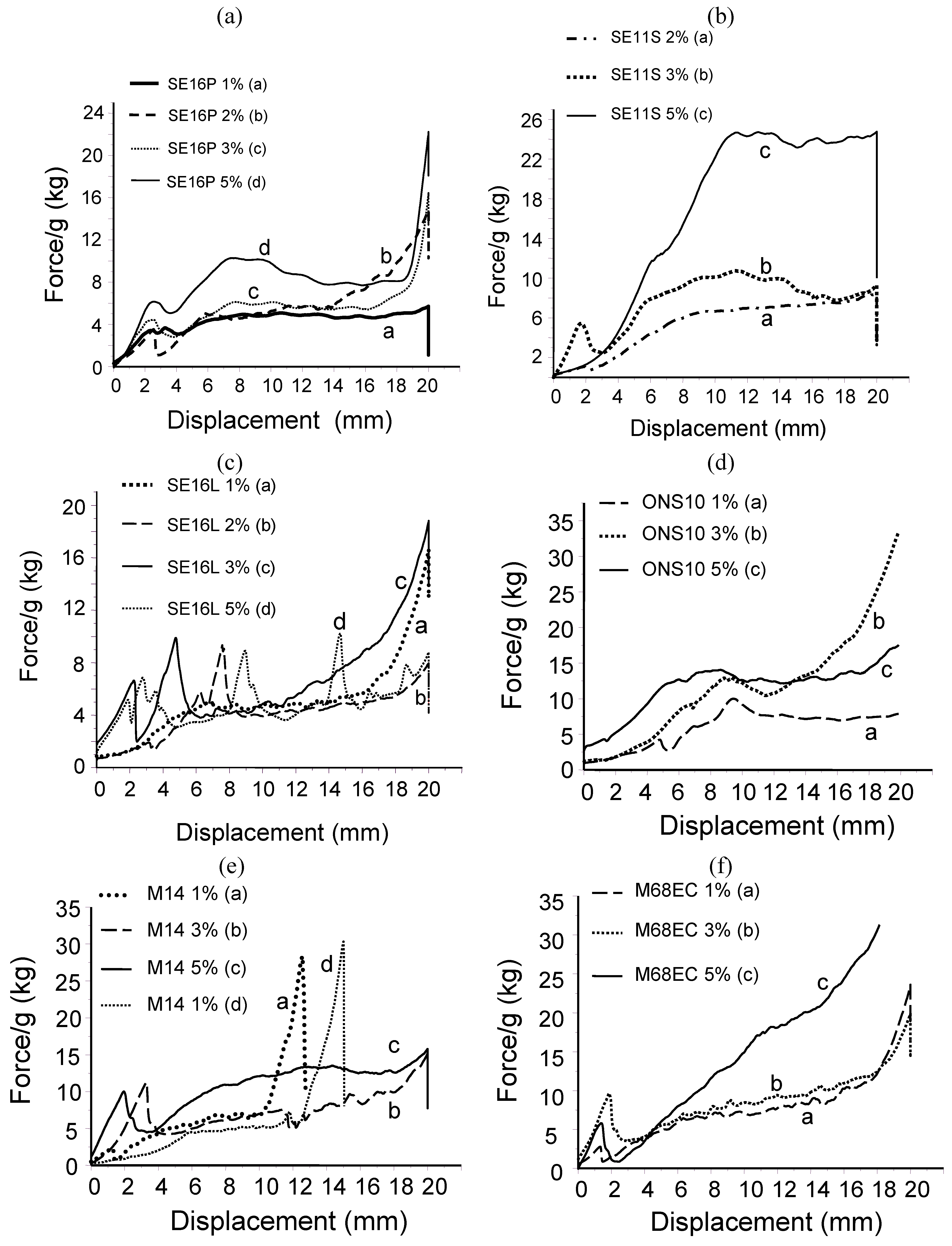 More complete data were extracted from force-displacement curves measured during extrusion (Figure 1a–g). We found quite good reproducibility, significant and quantitative results with the mechanical test machine. The curves obtained are quite similar to those obtained by Bohner et al. [3] or Gauthier et al [17]. The first ones tested the injectability of cement added with xanthan gum, while the second ones tested a formulation of calcium phosphate ceramic granules with hydroxypropyl-methyl-cellulose. In our study, in the case of cement without additives, the mechanical tester reached very quickly force overload and stopped. In this case, demixing and packing is observed and the curves cannot be registered. Conversely, by adding sugar surfactants, complete extrusion can be monitored with nearly any surfactant, independent of the amount. Many curves displayed the same pattern (with Cementek: Figure 1a–f or with Cementek LV: Figure 1g). Most curves displayed a small peak or irregularities at the onset, which has been first attributed to a step corresponding to the packing of the paste, loosely introduced in the syringe, and secondly to a slightly higher force needed for pushing the very beginning of the paste in the needle. Once the flow is established, this starting peak decreased. Most of the curves also displayed a plateau or a very slightly increasing force during a large part of the extrusion process. This means that in these samples, the viscosity does not change a lot and the paste keeps a good homogeneity. This plateau, expressed in kg, is also significant of a more or less easy extrusion, and depends on the additive and its amount. Many of the additives enabled a full extrusion at a force lower than 10 kg, namely, affordable by hand. Up-scaling with a full sample of Cementek (16 cm3, with SE16P) injected in the surgical device (11G needle) also demonstrated a very easy extrusion by hand. On few other compositions (with Cementek: M68EC 5%, ONS 3%, SE16L 3%; with Cementek LV Figure 1g: M68EC 2% and M14 2%), this behavior with constant or slow increase of the force is not observed. Instead, a strong increase of the force is observed for the entire extrusion. Finally, with SE11S 5%, after a rapid increase of the force, a plateau at a higher force (≈25 kg) is observed at the end of extrusion. As it was found during extrusion by hand (Table 1), the curves also showed that over 1% the injectability was less easy. In Table 1, this is shown by the lower quantity of the extruded mass, while in the curves in Figure 1, this is shown by the higher pressure required for extrusion. With the machine, however, most of the time complete injectability is still possible, because a higher force can be applied compared with by hand. In fact, the stabilization of the solid-liquid dispersion, which impairs demixing, and the lubrication effect requires a low amount of surfactant. Any higher percentage of surfactant is effective also for stabilization and lubrication, but induces an increase of the viscosity. Classification of injectability at 1% surfactant with Cementek can be made in the following order: SE16L (4 kg) ≈ SE16P (4 kg) > ONS10 (7 kg) ≈ M68EC (7 kg) > M14 (blocking before the end). With Cementek LV loaded with 2% surfactant, this classification still holds, but on the whole, higher forces were required for extrusion compared with Cementek loaded with 2% or even 3% surfactant. Combination of polydimethylsiloxane and sugar surfactant as lubricating agents thus did not bring a favorable synergy. Finally formulations with Cementek loaded with 5% ONS10 and 5% M14 showed an easiest extrusion than with 5% SE11S or 5% M68EC. Alkylpolyglucosides (APG), namely M68EC, M14 and ONS10, led to full injectability too, except for M14 1%. However, most often, higher forces were required compared with sucrose esters. In conclusion, the sucrose ester SE16P showed the best behavior in terms of injectability, and any amount from 1 to 3% can be selected since nearly the same force for extrusion was required. These experiments also demonstrated that the force required for extrusion is quite sensitive to the precise structure of the selected surfactants. Despite that their structures are quite similar (see Supplemental Materials), significant differences have been obtained. This could explain why an improvement of injectability was not pointed out in former studies in which surfactants were added (SDS, Sorbitan esters [30,8]), or why in other studies, much more additive was required to get full injectability (albumen [7]).