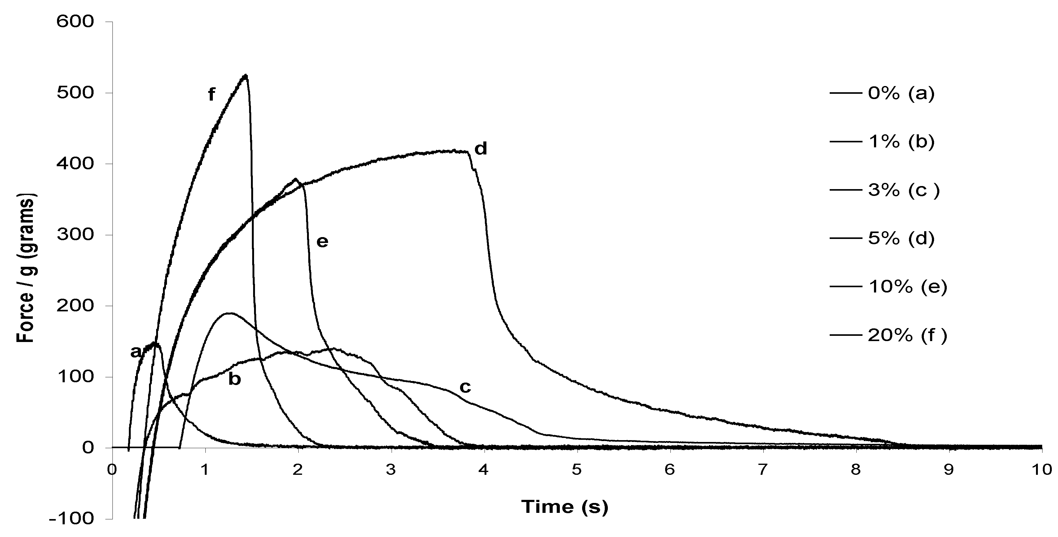 The order of magnitude of the adhesion energy and maximum tensile stress is similar to what has been obtained in the case of solutions of some carbohydrates, such as maltodextrins (maximum stress ≈ 1–3 kPa) [31], carrageenan (maximum stress ≈ 10–20 kPa) [32] or sugar glasses (maximum stress ≈ 1–3 kPa) [33]. We can notice also that the higher values of adhesiveness obtained with sucrose esters did not require such high amounts, since 5% of additive was enough to get these values. They remain, however, far from the values corresponding to “true” adhesives. By taking the example of acrylic pressure-sensitive adhesives, the order of magnitude of maximum tensile stress lies between ≈100–1000 kPa [34]. Another example can be given: a stick of paper white glue has been used as a reference with our probes in our conditions, for which adhesion energy was found to be about 18 J/m2 on nylon (max. stress 14 mN/mm2), and 13 J/m2 on bone. As a consequence, the adhesive properties of these cements should be helpful for assisting a better positioning of the cement and to ensure a better contact with bone, but without impairing easy handling or injectability by being too sticky.