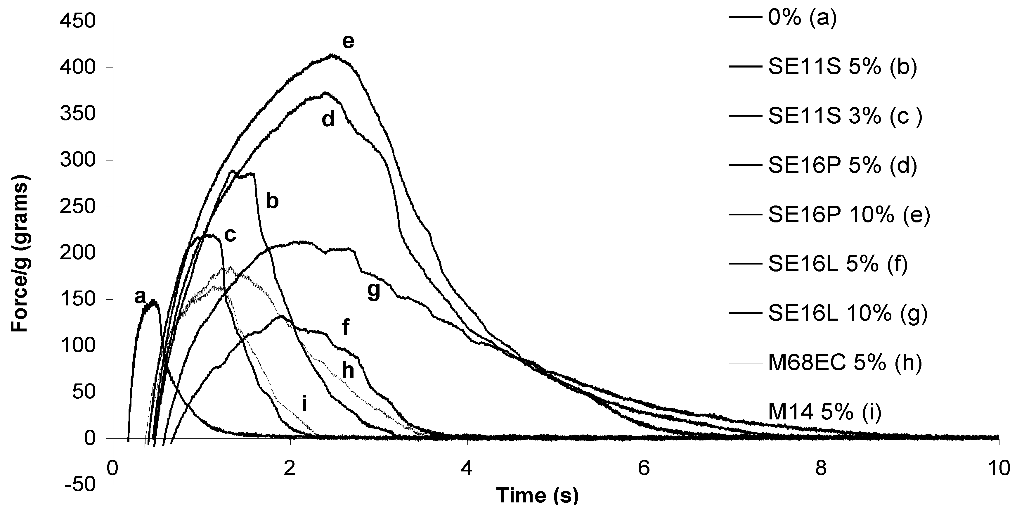 Probe-tack adhesion curves of Cementek with increasing amounts of SE16P (nylon probe).