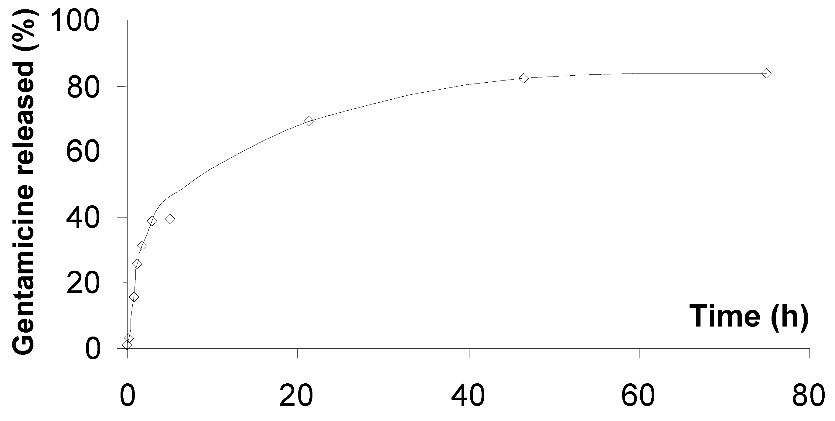 Tests of controlled release of gentamicine included in cement have been made. Gentamicine (loaded at 25.15 mg/g of cement powder, corresponding to 2.5% w/w of cement powder or 1.7% w/w of solid + liquid phase) was mixed with the cement powder containing 2% SE16P. After mixing with the aqueous phase, the resulting cement paste was poured in a controlled volume of water (6 mL). Aliquots were sampled with time and the amount of gentamicine released was quantified by HPLC. The resulting curve is plotted in Figure 4. It can be seen that the release remained progressive, and quite slow without “flash” effect. After three days, 84% of the antibiotic was released in the solution. For 1 g of cement powder, 72% was released the first day, corresponding to 18.9 mg over 24 h. The second day, 10% more was released (2.5 mg). Finally the third day, 2% more was released, corresponding to 0.50 mg over this period. A slow continuation of the release is expected over this three day period. The kinetics of release at the beginning of the curve was quite similar to what has been observed by other authors [21]. It was somewhat faster compared with tetracycline incorporated in the same cement (Cementek, 5% tetracycline added), but without additive [14], which could be explained by both the higher porosity of Cementek with 2% SE16P added and the much higher hydrosolubility of gentamicine. To compare with implants for which in vivo release has been studied, a calcium phosphate glass implant loaded with gentamicine (7 mg gentamicine for 200 mg of CaP glass, namely 35 mg/g) led to a continuous increase of the gentamicine concentration in the surrounding bone during four weeks, with a maximal concentration of 14 μg/mL reached [35]. In another study, a calcium phosphate implant coated with PLA and loaded with 3.5% w/w gentamicine reached a maximal concentration of gentamicine of ≈18 μg/g of bone after one week, while the therapeutic range of gentamicine is 3–10 μg/mL [36].