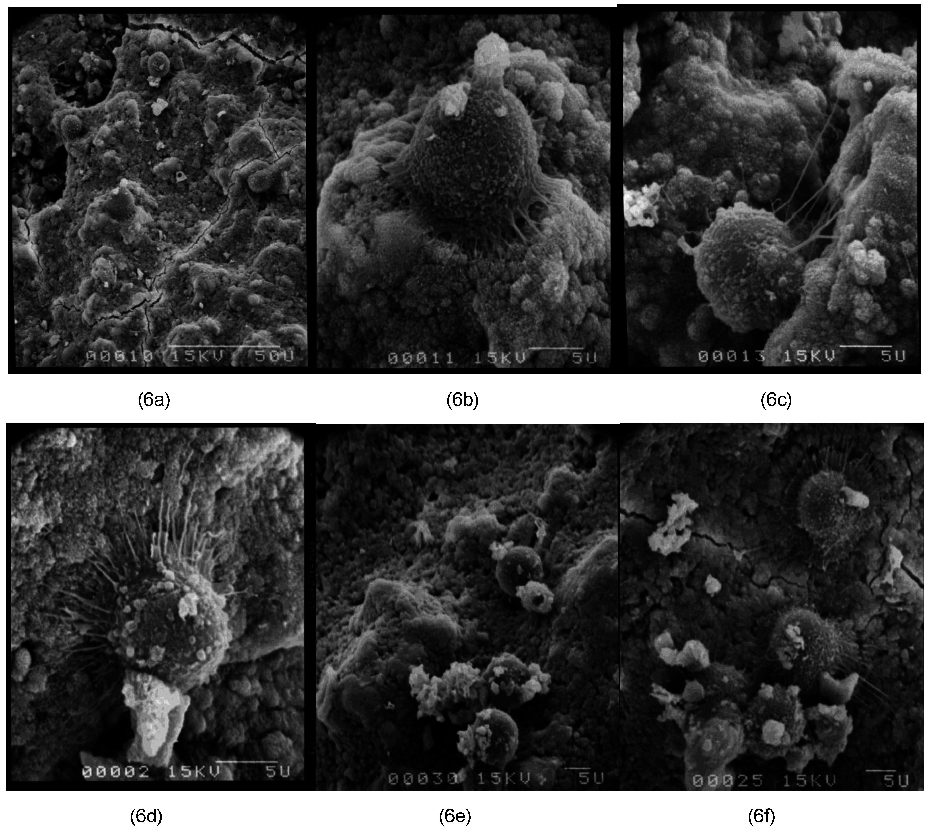 Human osteoblasts were seeded on cement tablets containing 1 or 2% of sucrose esters or alkylpolyglucosides, in order to test the biocompatibility of the samples. After 24 hours of culture on the cements, the percentage of viable cells, relative to the tissue culture plastic wells (control TCP well), was determined by MTT (Figure 5) and the morphology of the cells was observed by Scanning Electron Microscopy (SEM) on selected compositions (Figures 6a–f). The following trends can be extracted from the results. By adding 1% of sucrose esters (SE16P or SE11S), the number of viable cells was similar to the tablet without surfactant. This number of viable cells was a little higher when 1% M68EC was added compared to the tablet without surfactant. When 2% of surfactant was added, a systematic decrease of the cell number was obtained. In some studies with sintered calcium phosphate cements, decrease of the cell number with increasing porosity has been observed [37] (or not [38]). This effect on cell viability has been attributed to the cytotoxicity of the released particles [39,40,41]. Such an effect can be an explanation for the decrease observed in our compositions from 1 to 2% of surfactant, since hydraulic cements are even more prone to particles release. Morphology and spreading of the osteoblasts cultured for 24 h on the tablets were observed by SEM (Figures 6a–f). The SEM pictures tended to show strong anchorage of osteoblasts cultured on cement tablets with sucrose esters. Cells were spherical and exhibited numerous and sometimes very long filopodia. This spherical morphology corresponds to the starting phase of the proliferation [42]. Sections of tablets have also been observed in order to assess the penetration depth of the cells inside the tablets. Osteoblasts could be seen up to two-thirds of the thickness of the tablet, showing a penetration and a survival of the cells inside the sample over more than 1 mm after 24 h, through interconnected cavities. With the alkylpolyglucoside M68EC, cells looked completely spherical, and filopodia were not clearly observed. The cells spread over about one-third of the sample thickness. In the sample without surfactant, cells were seen essentially at the surface of the tablet. These results are correctly in relation with the measured porosity, decreasing from sucrose esters to M68EC to samples without surfactant (respectively, 54%, 53%, 51% and 46% for porosity with SE11S, SE16P, M68EC and without surfactant, see Part One [13]).