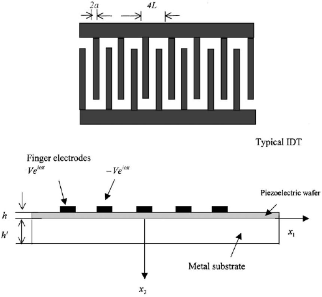Nowadays, an important application field of IDT is in the health monitoring of structures. A practical IDT with finite length bonded by a metal plate is shown in Figure 2 [15]. IDT is a thin piezoelectric film surface bonded on either piezoelectric or unpiezoelectric substrate for the use of wave excitation or reception of structures. On the surface of the wafer, a pattern of electrodes is designed, which comprises two alternating sets of fingers connected to external electric power sources for the energy supply. Since IDT is bonded on a piezoelectric layer which is surface bonded on the metal substrate, the piezoelectric effects must be modeled in the dispersion characteristics of the piezoelectric coupled structure. Jin et al. [12] derived the lamb wave propagation in a metallic semi-infinite medium covered with piezoelectric layer. Wang et al. [11,96] studied the Love wave propagation in a semi-infinite metal medium with a piezoelectric layer mounted on the surface. The Bleustein-Gulyaev wave was observed for the first mode of the wave solution. Some other wave modes were also observed. The mode shapes of the electric potential and displacement were studied as well in their work. Wang and Varadan [14,15] derived the dispersion characteristics of the wave propagation of SH wave and the analytical solution for SH wave propagation excited by IDT in a piezoelectric coupled plate. Both infinitely long and finitely long IDT were modeled.