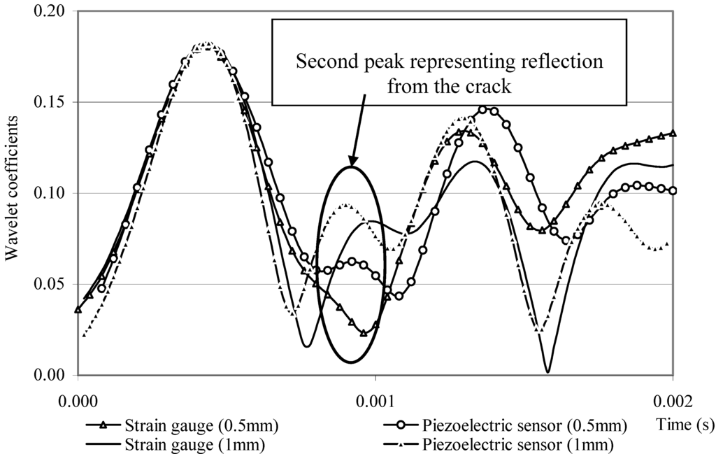 Figure 4. Wavelet coefficients at scale 12 of signals from piezoelectric sensor and strain gauge for 0.5 mm and 1 mm deep cracks (adopted from Figure 4 in [5]).