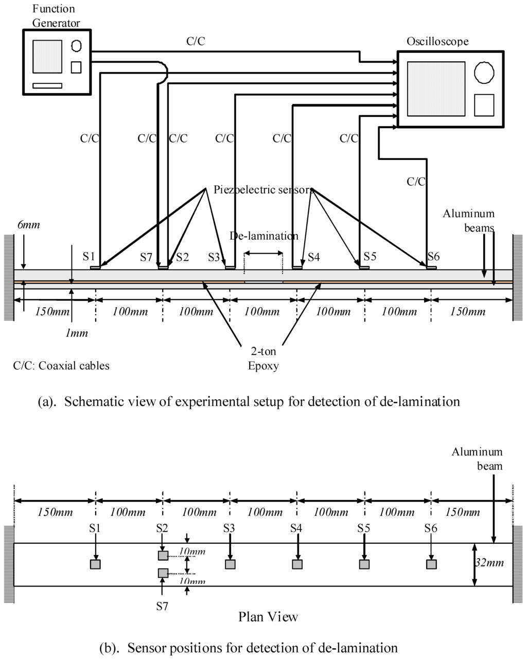 The piezoelectric sensors and actuator and HHT are also used in detecting the delamination in a beam as shown in Figure 5. The idea to detect the delamination is that when a wave propagates through a beam with delamination, the velocity through the intact section and the velocity through the delaminated section will be different. By sensing the wave at regular intervals along the beam, any section that is delaminated may be detected based on the arrival times of the impact wave. Two 32 mm wide aluminum strips with thickness of 6 mm and 1 mm are glued together throughout their length using epoxy with strength of 2-ton, leaving a 60 mm gap at the centre portion of the beam. The beam is set-up to have a span of 800 mm with six piezoelectric sensors S1–S6 and one actuator S7 attached along the beam, as shown in Figure 5. Co-axial cables are used to connect the sensors and actuators to the function generator and oscilloscope. The results show the wave velocity of 2,105 ms−1 across the healthy area and a velocity of 1,639 ms−1 through the delaminated area, indicating the effectiveness of piezoelectric sensors and HHT in the detection of delaminated beam.