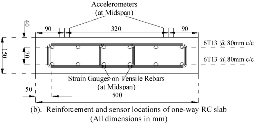 Koh [121] experimentally studied the properties of a simply-supported one-way RC slab with a cross section of 500 mm by 15 mm and a span of 2,700 mm. The RC slab undergoes various degrees of damage when subjected to increasing magnitude of third point loads, namely, at zero, first crack, 30 kN and yield loads. An impact hammer is used to induce vibration in the slab at each stage and the response is recorded using the piezo-accelerometers attached to the top surface of the slab and the strain gauges under the tensile reinforcement bars at the mid-span section (Figure 6). The signals are processed using HHT. The data from the accelerometers and the strain gauges show similar features. The results show that the frequency decreases as the degree of damage increases with a total reduction of 23% in the fundamental frequency from the healthy stage to the yield stage, which is significant. It is also observed that the major reduction in the frequency occurs between the first crack and 37.5% of the yield load where the tensile cracks tend to propagate rapidly in the thickness direction of the slab, causing significant reduction in stiffness.