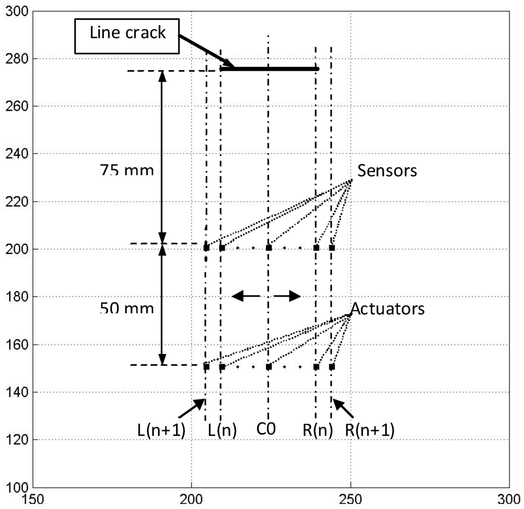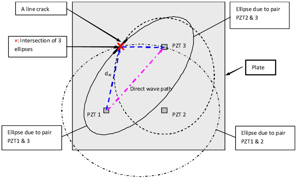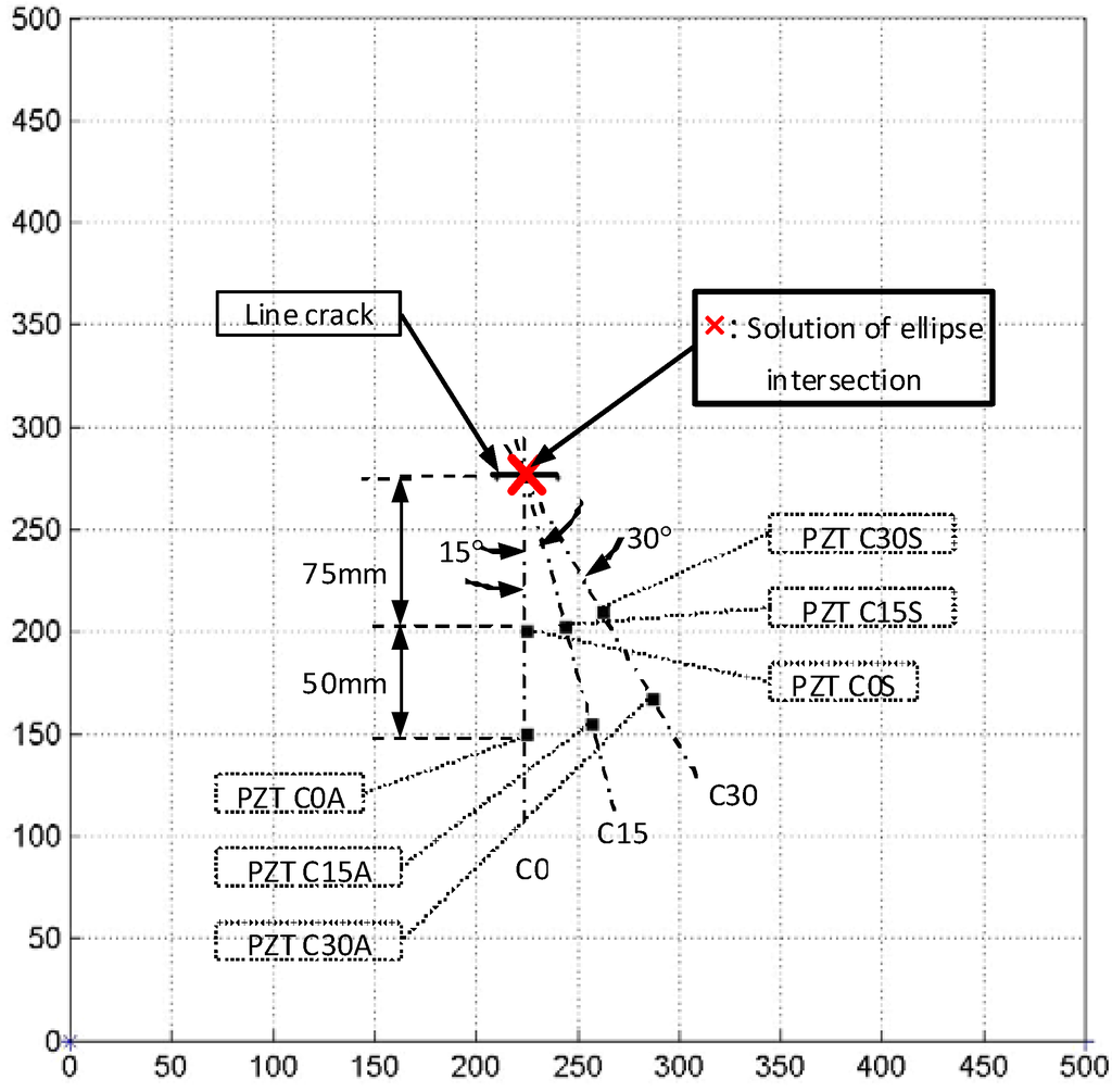 In order to detect the defects in a plate structure, the location, orientation and damage extent of a crack need to be identified. Tua et al. [20] proposed an elliptical loci method to locate the possible defect positions. Consider an ellipse with PZT1 and PZT3 as the foci, the sum of the distances from any crack on the ellipse to those two foci is constant and equal to the major diameter of the ellipse. In order to identify the exact location of the crack from the infinite solution provided by one ellipse, signals from actuator/sensor pairs at different positions need to be used. This will allow more ellipses to be constructed and their intersection will then provide an estimated location of the crack. A minimum of three ellipses provides an unambiguous estimate of the location, as illustrated in Figure 7. Once the position of the crack is determined based on the intersection of 3 ellipses, the next step is to determine the orientation and extent of the crack. To determine the orientation, two PZTs are placed collinear with the identified crack location at two different positions, for example as shown in Figure 8, C0S is the sensor location and C0A is the actuator location along the line C0. Based on Huygen’s principle and Snell’s Law (incident and reflected angle of the wave are equal), the normal direction of the crack can be determined by monitoring the energy of the crack reflection peak in the spectra for lines of different angles. Once the orientation of the crack is determined, the actuators and sensors may then be shifted in parallel to positions on the left and right of line C0 (see Figure 9). For each position, Lamb wave is then actuated and the spectrum of the signal from the sensor is plotted. The position at which the energy peak first vanishes from the spectrum due to the reflection from the crack indicates the end of the crack. The accuracy of the damage extent can be obtained by using smaller step shifts near both ends. The proposed comprehensive methodology to detect the location, orientation and damage extent of a crack was successfully applied in (1) detection of micro-width cracks of size 330 and 220 μm on an aluminum plate; (2) detecting and locating cracks in-filled with impurities such as grease, araldite epoxy, metallic epoxy and spray paint; (3) detection of a notch in weld.