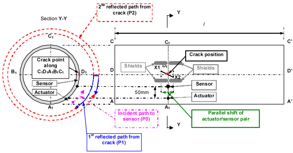 The proposed methodology [20] to detect the location, orientation and damage extent of a crack in a plate was further extended to detect and locate cracks in homogenous pipes by Tua et al. [23,24]. By observing the attenuation in the strength of the direct wave incidence at the sensor, the presence of a crack can be determined. As shown in Figure 10, at least four actuation positions with two on each end of the pipe segment of interest are needed to exhaustively interrogate for the presence of cracks. It has been shown experimentally that the detection using a circular piezoelectric actuator and sensor, with dimensions of 5 mm diameter and 0.5 mm thickness, was possible for an aluminum pipe segment of up to at least 4 m in length. The proposed methodology was also explored for an aluminum pipe under more practical situations, such as burying it in sand with only the actuator and sensor positions exposed. Experimental results obtained showed the feasibility of detecting the ‘concealed’ crack on pipes buried in sand.