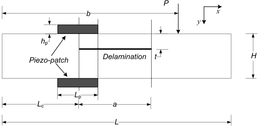 Wang and Quek [53] presented a simple model as shown in Figure 11 for the repair of delaminated beams subjected to concentrated static load via piezoelectric patches. The delaminated beam is subjected to a static load P and is to be repaired using piezoelectric patches. The material and geometric parameters of the delaminated beam are denoted as E for the Young’s modulus of the host beam, T its width, H its thickness, t the thickness of the upper delaminated layer and a the length of the delamination. Their analysis revealed that sliding mode fracture was induced at the tips of the delamination under flexural action of the beam, leading to stress singularity. A simple repair methodology via piezoelectric patches was introduced to remove this singularity. The concept is to balance the axial force induced in the delaminated beam during bending by applying a counteracting force via piezoelectric patches. To repair the beam, two piezoelectric patches with the same thickness h p and length L p are attached. Similar studies were also conducted for the repair of notched beam under static load [51] and dynamic load [52], notched column under axially compressive static load [54], and delaminated beams under compressive force [55], based on simple Euler-Bernoulli beam theory.