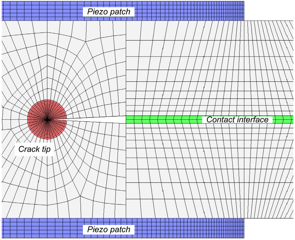 Figure 12. FE discretization for crack tip, piezoelectric patches and contact interface (adopted from Figure 3 in [56]).