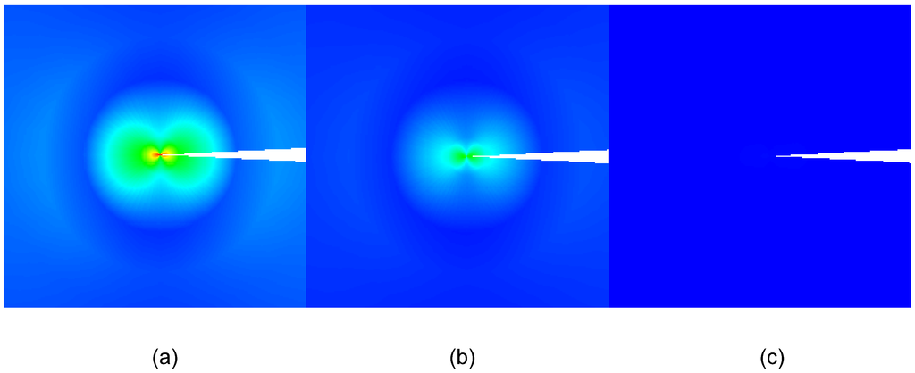 Figure 13. Von-Mises stress field around crack tip with different applied voltages on piezoelectric patches (a) 0 V, (b) 300 V and (c) 480 V (adopted from Figure 5 in [56]).