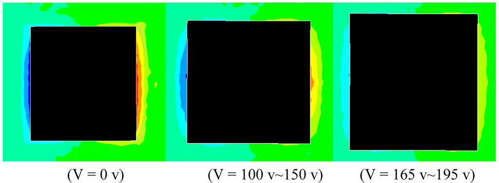 Figure 15. FEM simulation of shear stress distributions along delamination edges with different voltages (adopted from Figure 4 in [58]).