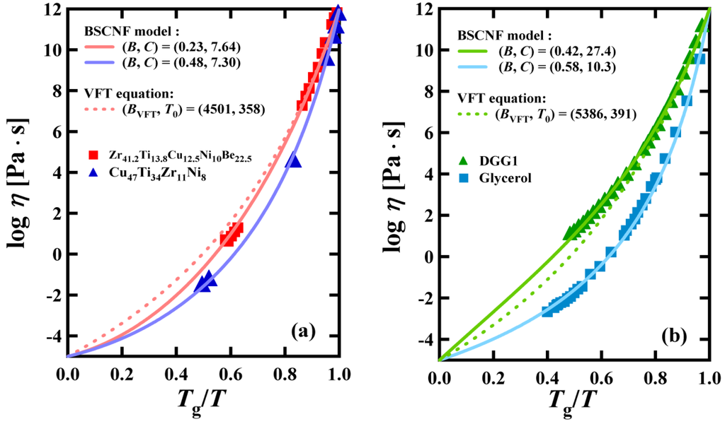 Figure 1 shows some applications of the BSCNF model. The viscosity of bulk metallic glass forming liquids such as Zr41Ti13.8Cu12.5Ni10Be22.5 and Cu47Ti34Zr11Ni8, and other type of materials such as DGG1 (a kind of soda lime silicate glass) and Glycerol, are shown in Figure 1 (a) and (b), respectively. As can be seen in these figures, the BSCNF model reproduces the viscosity data better than the VFT equation.