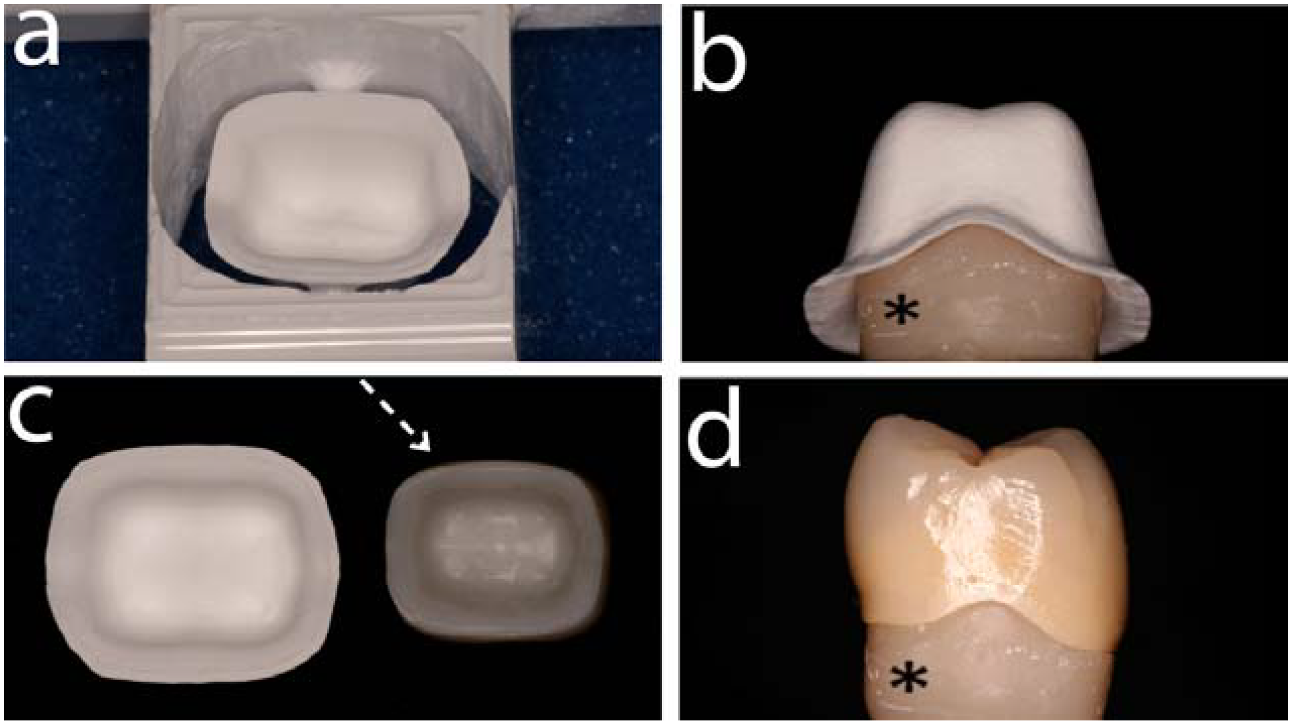 This sequence of images shows a molar crown restoration fabricated from a presintered zirconia (3Y-TZP) core (LAVA, 3M-ESPE). The pre-sintered 3Y-TZP block was machined (a) producing an enlarged zirconia framework core (b). Compare the core size related to scanned dowel (black asterisk). The pre-sintered milled block is then fully sintered obtaining the final 3Y-TZP core or framework for further porcelain veneer application. (c) shows the sintering shrinkage amounting to ~25% of the enlarged core as a compensation for the controlled sintering process. Note the shadow of the porcelain through the sintered core segmented (white arrow). (d) shows a mesial-side view of the final crown properly seated on the dowel (black asterisk).