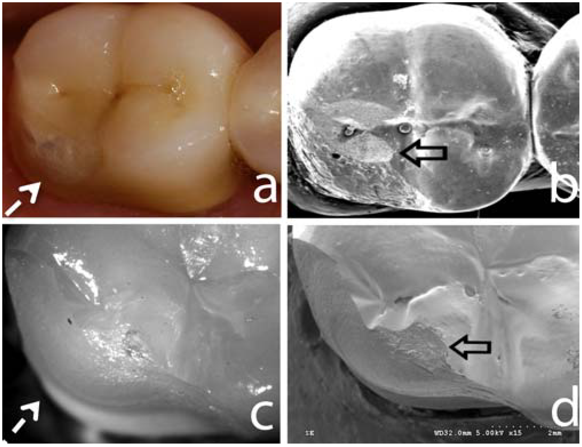 Image (a) shows a typical clinical fracture (segmented white arrow) of a zirconia-supported all-ceramic restoration after 3 years of service. Image (b) shows a SEM image of the correspondent fracture in (a). Open black arrow points to the rough surface created by occlusal adjustment, supposedly the fracture initiation site. Image (c) is a light polarized picture of fractured specimen obtained using the sliding contact fatigue testing method. Note the similar fracture pattern (d) that this method creates compared to the clinical fracture presented in (a), showing that this methods mimics the in vivo fracture modes. The SEM of the fractured site of the in vivo tested sample (d) is evidenced by the wear facet created by the indenter (open black arrow), similarly what is seen on the SEM image in (b).