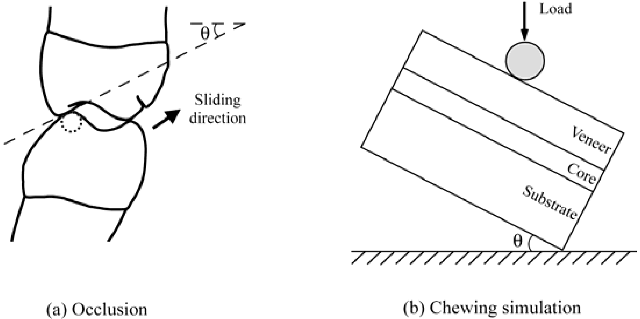 The schematic shows (a) posterior tooth contact in a chewing cycle as an eccentric contact of the mandibular buccal cusps with the inner inclines of the maxillary buccal cusps, followed by a sliding movement through centric occlusion, and then lifting off; (b) represents the sliding movement as a straight-line motion of a spherical indenter on the surface of a flat brittle layer (crown) supported by a complaint substrate (tooth dentin) with an inclination angle θ = 30°.