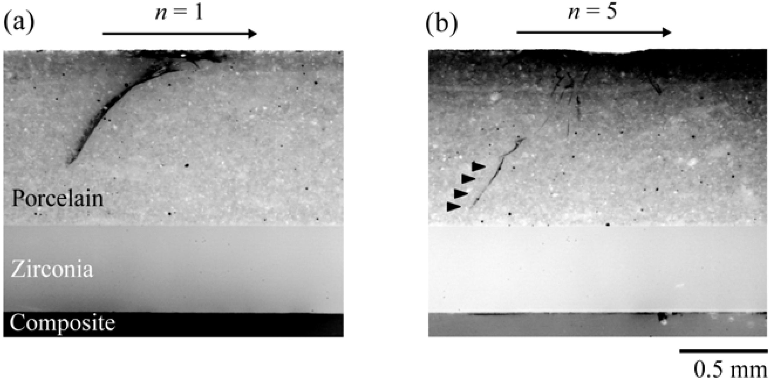 Figure 4 shows light polarized images of (a) a maximum fatigue load of 350 N. A partial cone crack has already propagated ~0.3 mm deep from the occlusal surface after the first loading cycle (black curvy line on the porcelain). (b) shows partial cones formed after 5 cycles. Black solid triangles point to the partial cone penetrating through the entire veneer porcelain.