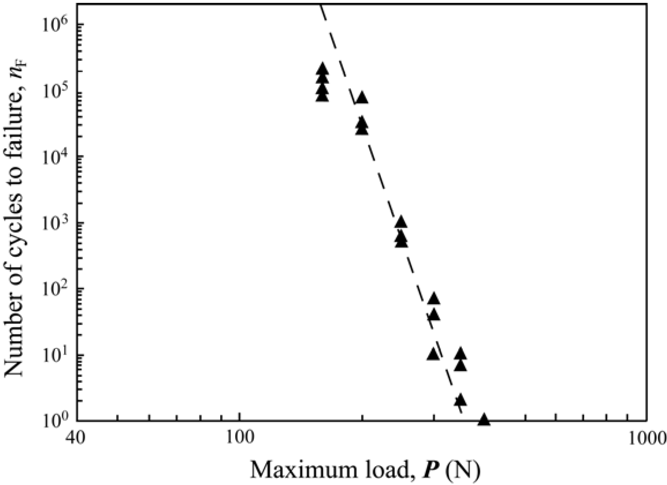 The graph represents a constructed damage map (load-cycles-type of failure) for porcelain/zirconia/composite trilayers subjected to off-axis fatigue loading .Note that for a high biting force (400 N or greater), cone cracks (black triangles) propagate through the entire porcelain veneers at first cycle. However, for a relatively low biting force (100–140 N), it takes several million cycles to propagate the cone cracks from the occlusal surface to the veneer/core interface.
