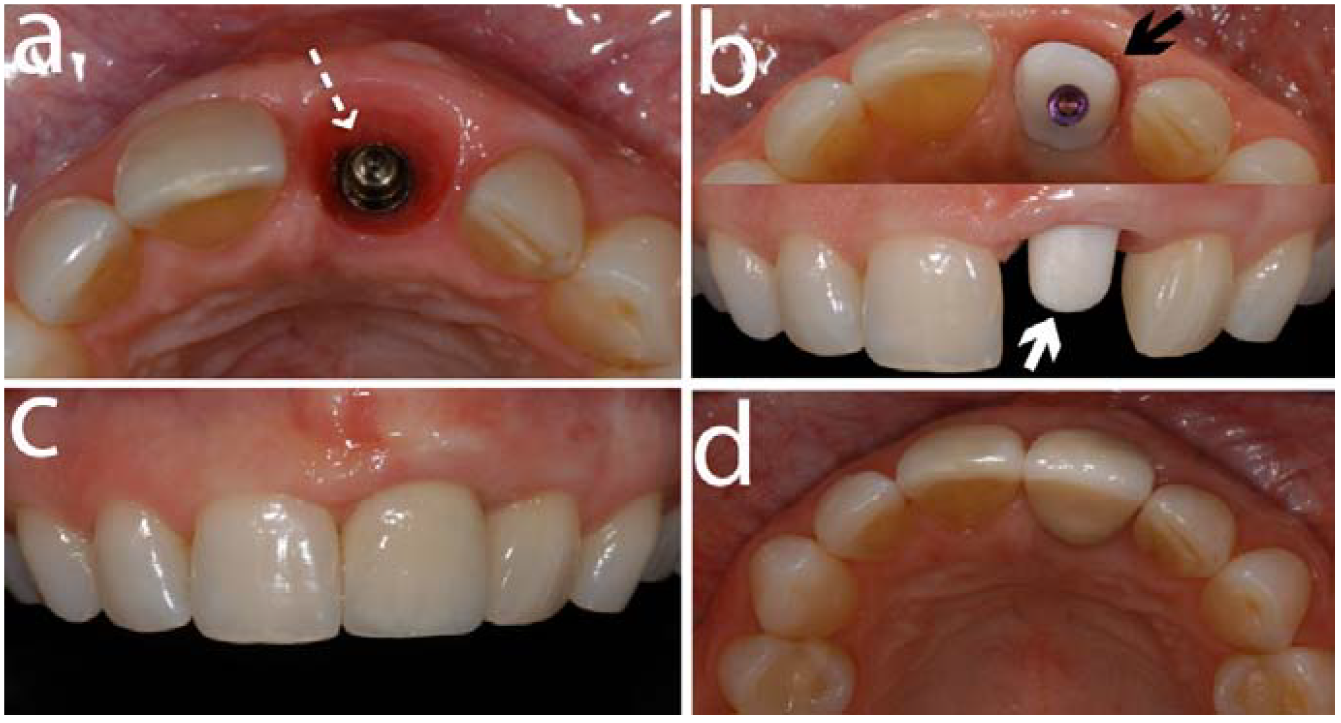 This sequence of clinical images shows a titanium implant (Straumann, Basel, Switzerland) placed (a) in a left central incisor area (segmented white arrow). (b) illustrates the occlusal view (black solid arrow) and front view (white solid arrow) of a zirconia abutment (Cares Abutment, Straumann, Basel, Switzerland) screw-retained on the implant. (c) and (d) are front and occlusal views respectively of the final restoration cemented on the abutment.