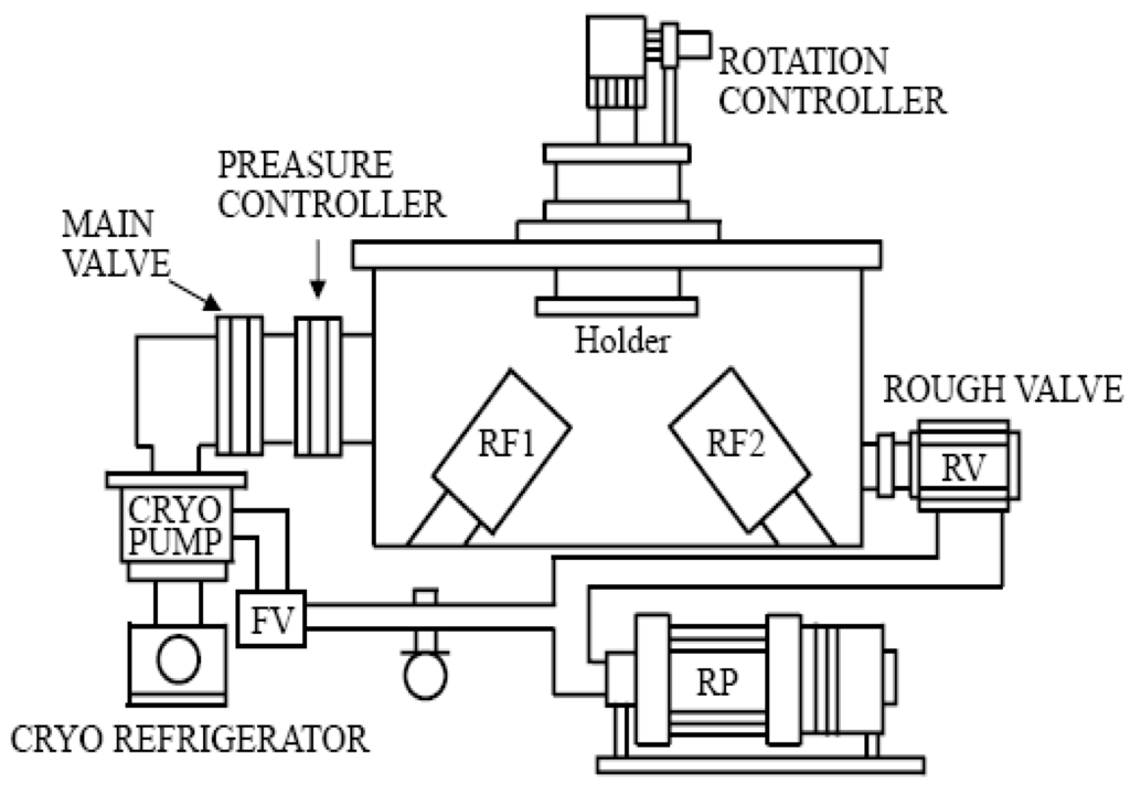 Rf sputtering is one of the most popular growth techniques for ZnO thin films. Although the earlier sputtered materials were polycrystalline or even amorphous, some research [16] has reported the high-quality single-crystal ZnO films deposited on sapphire (0001) by rf magnetron sputtering. They found that a high substrate temperature was essential to improve the crystal structure, but rf power had to be adjusted for the appropriate growth rate. We have extensively investigated the relationship between the crystal structure, doping concentration and properties of the sputtered films and the sputtering conditions [18,19,20]. Figure 1 shows a schematic of the rf magnetron co-sputtering system used in our lab. In this system [40], a dual rf power supply with synchronized phase is employed to control the rf power at the ZnO target and the dopant target, respectively. The substrate holder is rotating during the deposition to improve the uniformity of the thickness and the doping content of the deposited films. The substrate holder temperature can be controlled too.