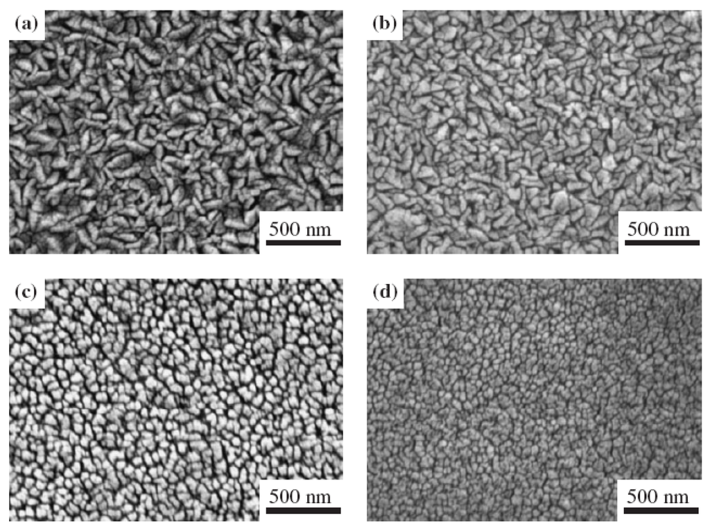 FE-SEM images of the (a) undoped ZnO and co-sputtered Al–ZnO films at theoretical Al atomic ratios of (b) 7.5, (c) 10, and (d) 12.5 at. %. Reprinted from [18] with permission.