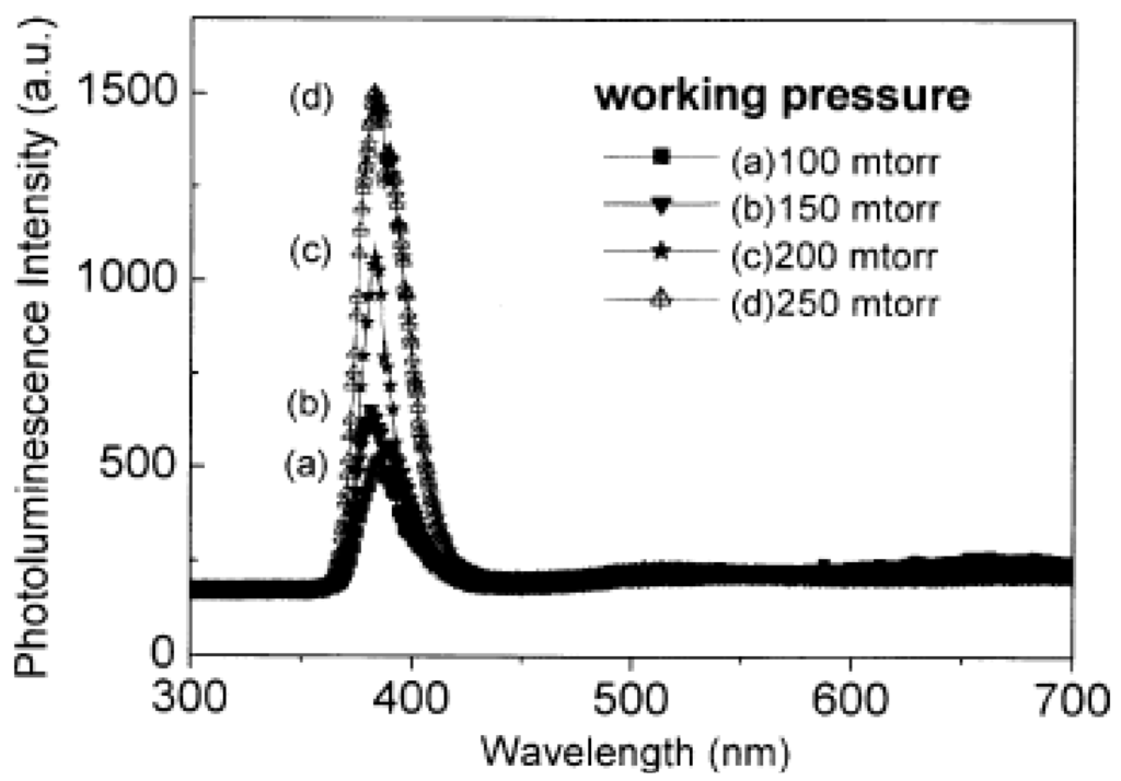 Photoluminescence spectra of ZnO films deposited under various working pressures. Reprinted from [19] with permission.