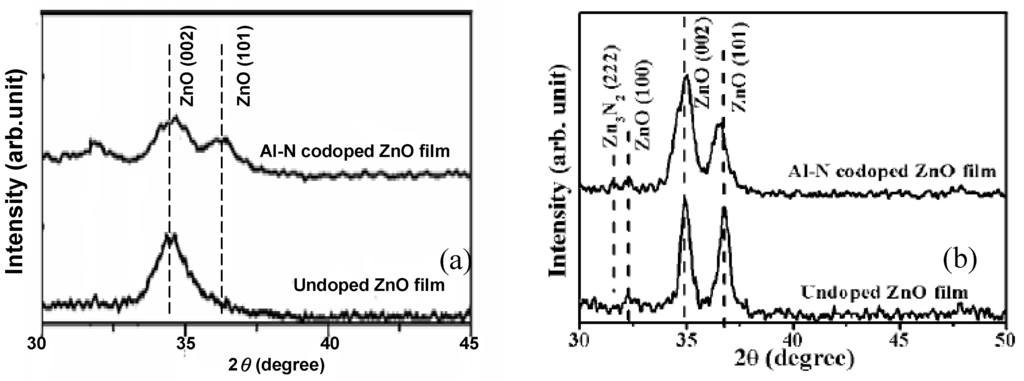 XPD patterns of undoped ZnO film and AlN codoped ZnO film (theoretical Al atomic ratio of 10%). (a) as-deposited (b) post-annealed at 400 °C under nitrogen ambient for 30 min. Reprinted from Ref. [20] with permission.